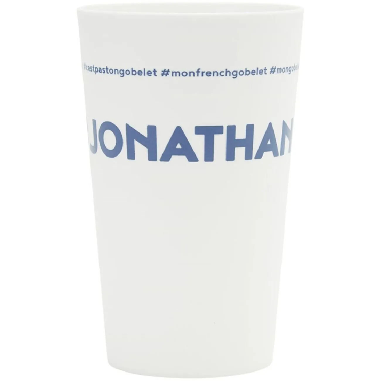 Gobelet réutilisable en plastique blanc avec inscription bleue #JONATHAN.