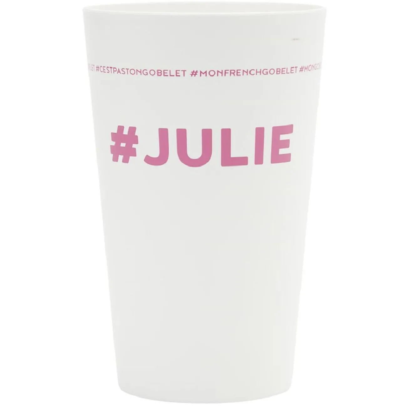 Gobelet réutilisable en plastique blanc avec inscription rose #JULIE.