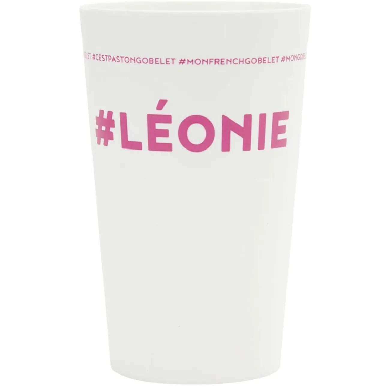 Gobelet réutilisable en plastique blanc avec inscription rose #LÉONIE.