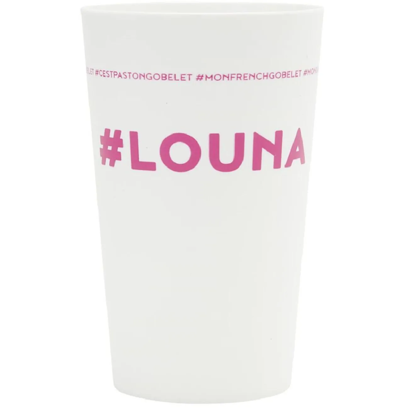 Gobelet réutilisable en plastique blanc avec inscription rose #LOUNA.