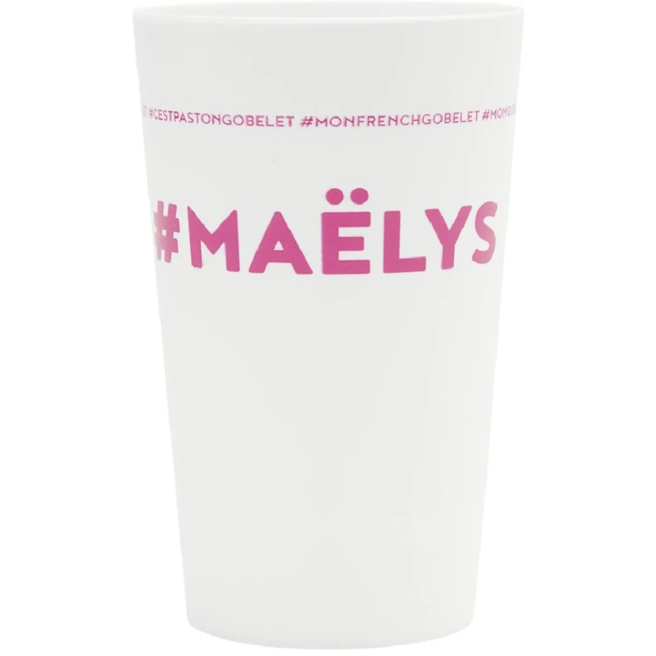 Gobelet réutilisable en plastique blanc avec inscription rose #MAËLYS.