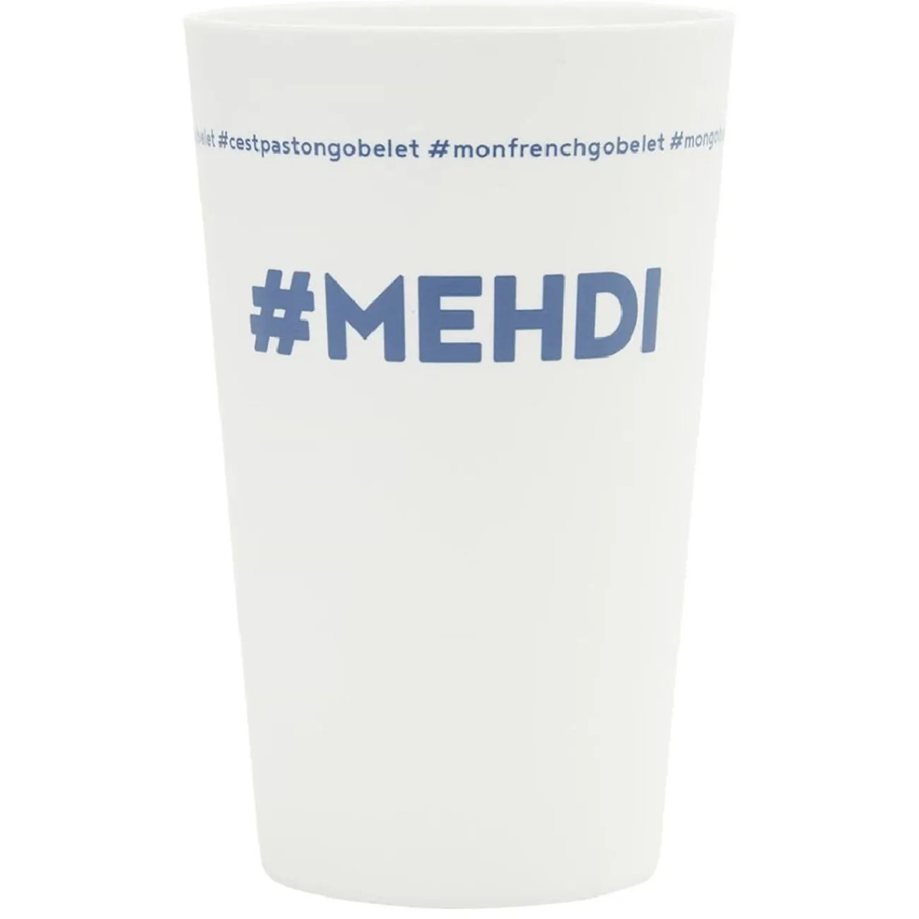 Gobelet réutilisable en plastique blanc avec inscription bleue #MEHDI.