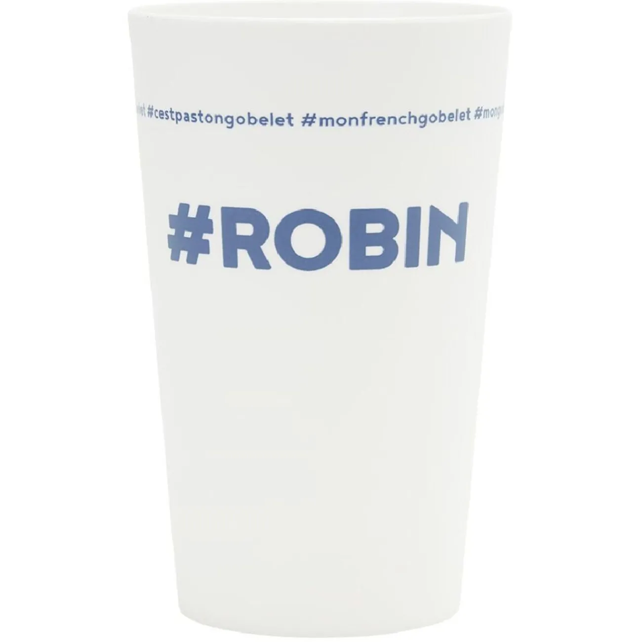 Gobelet réutilisable en plastique blanc avec inscription bleue #ROBIN.