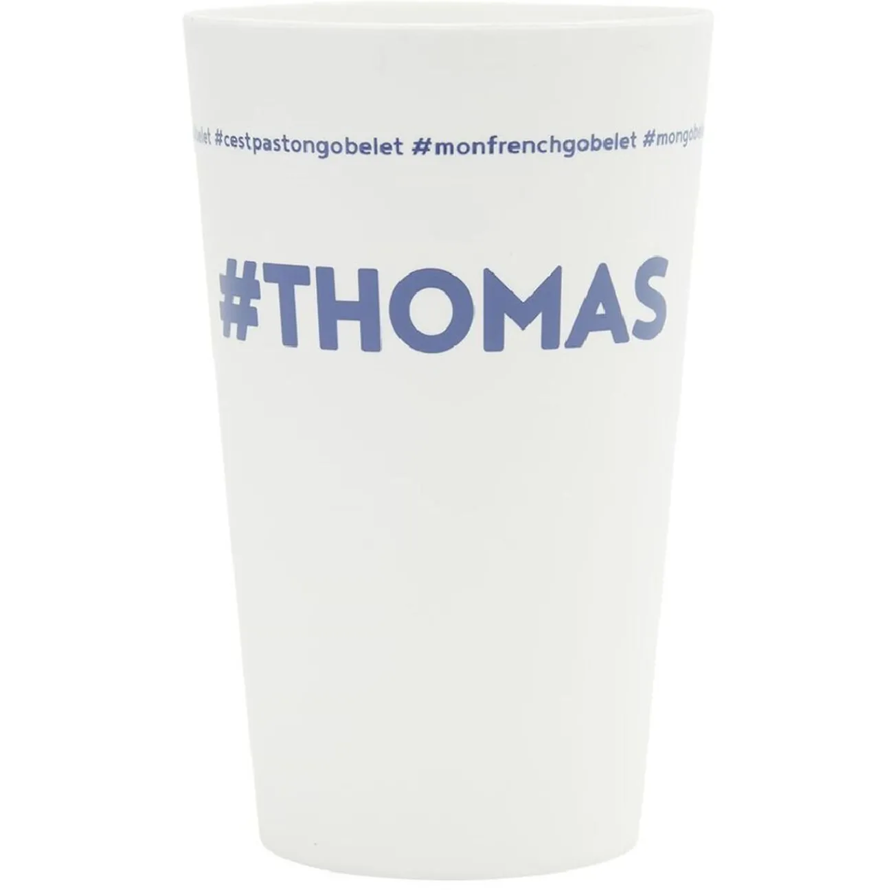 Gobelet réutilisable en plastique blanc avec inscription bleue #THOMAS.