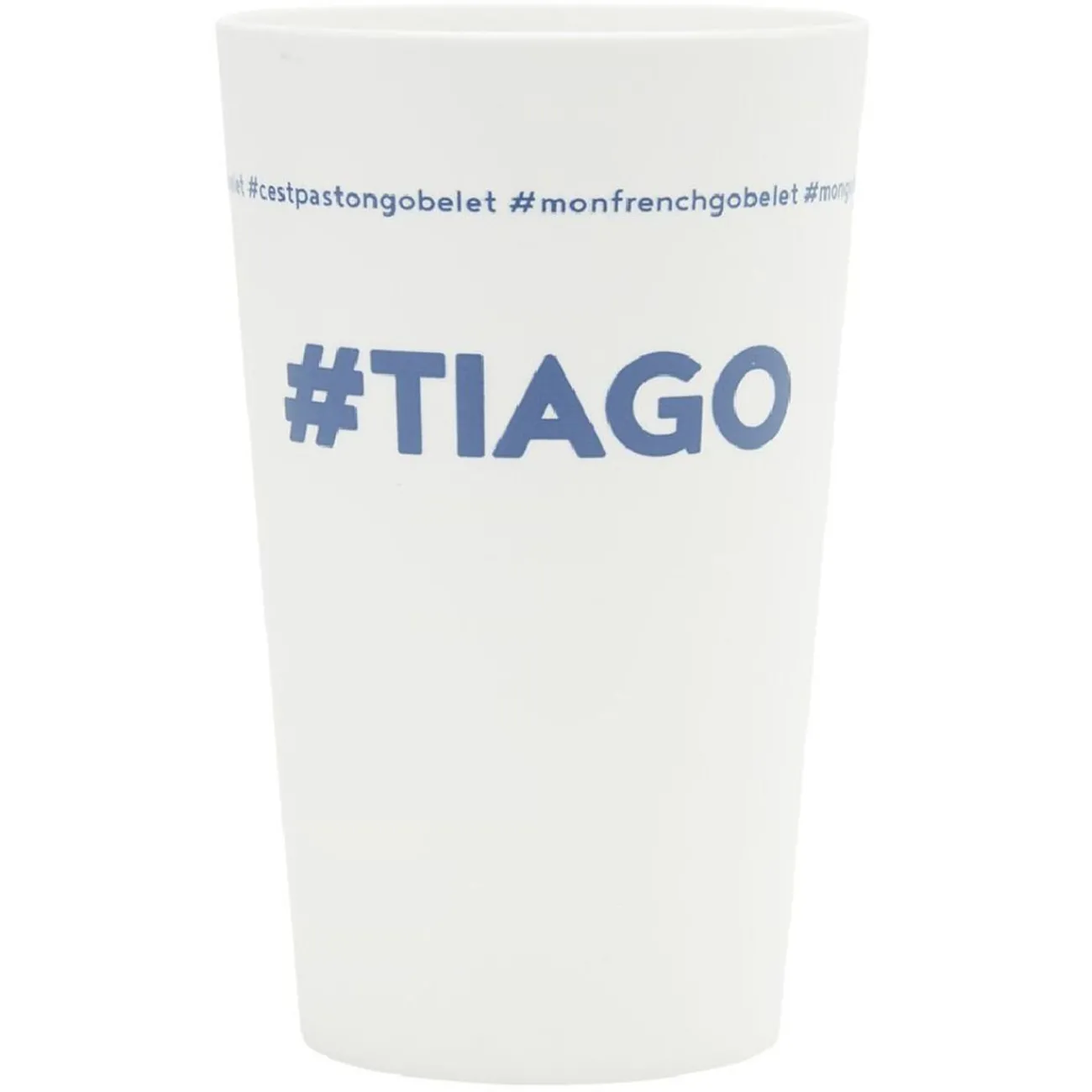 Gobelet réutilisable en plastique blanc avec inscription bleue #TIAGO.