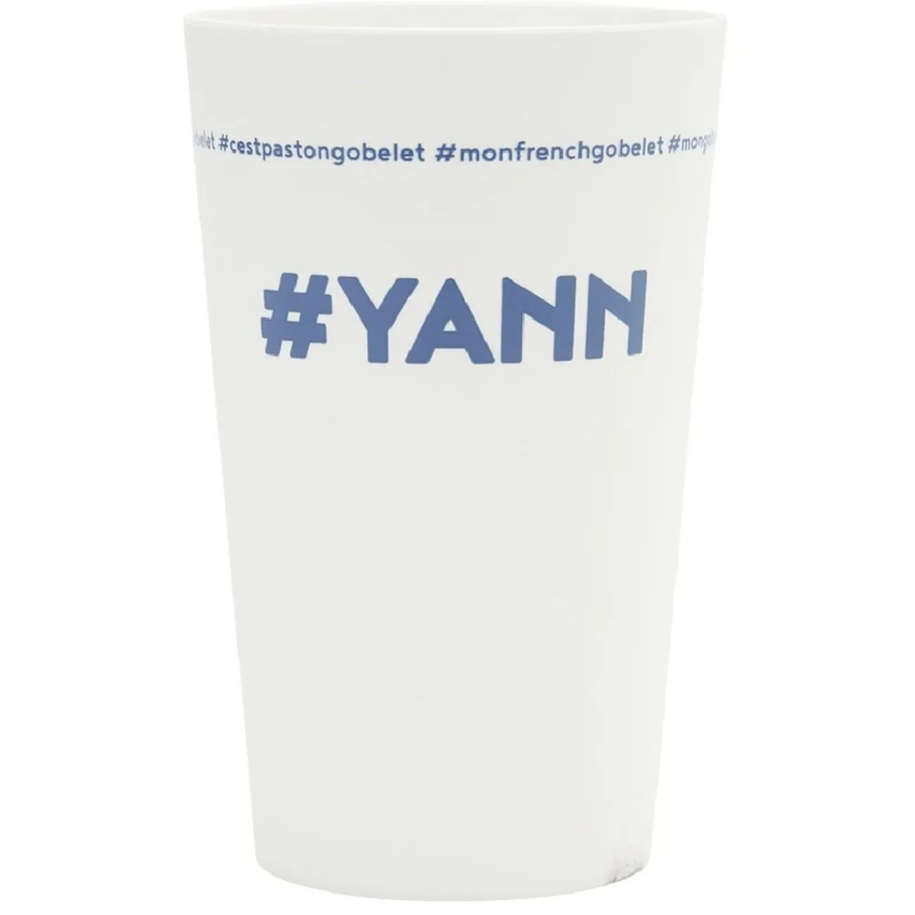 Gobelet réutilisable en plastique blanc avec inscription bleue #YANN.