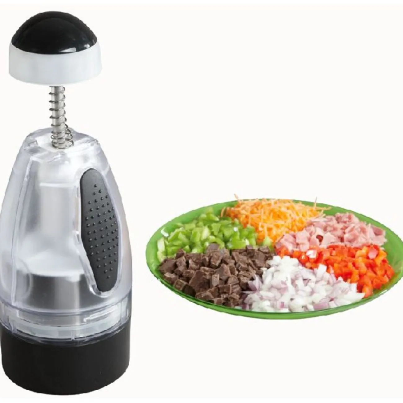 Hachoir émince-tout, H. 25 cm, polypropylène, lame acier inoxydable, bol récupérateur amovible, poussoir profilé, facile à nettoyer, démontable.