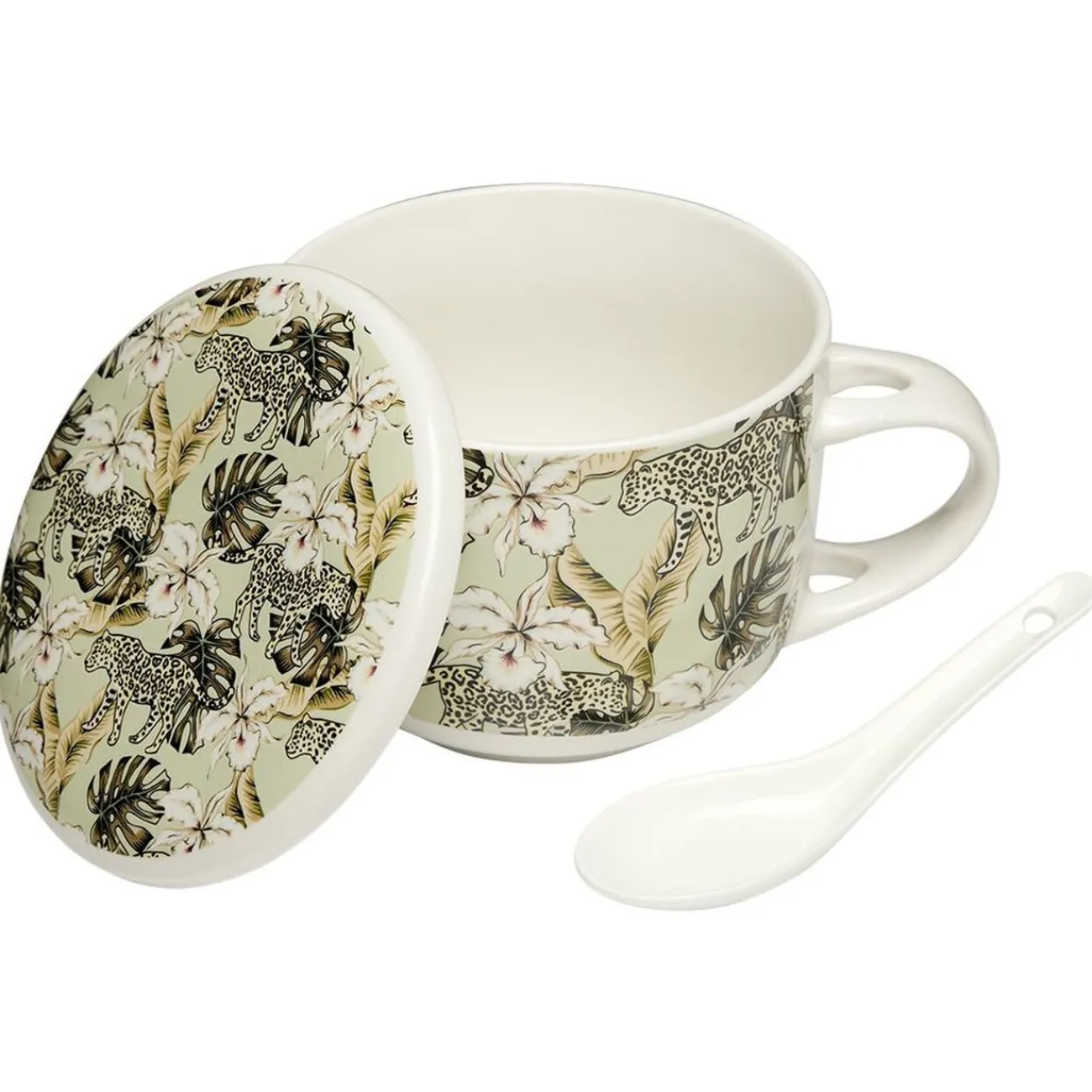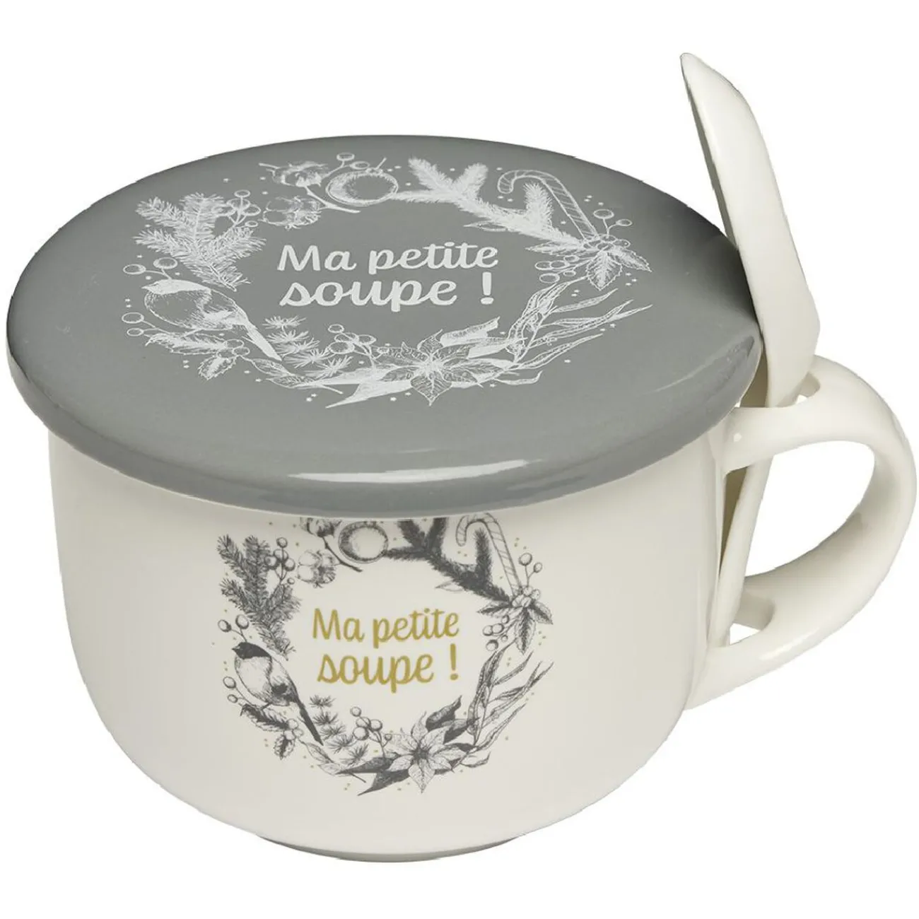 Jumbo en faïence avec cuillère et couvercle assortis.