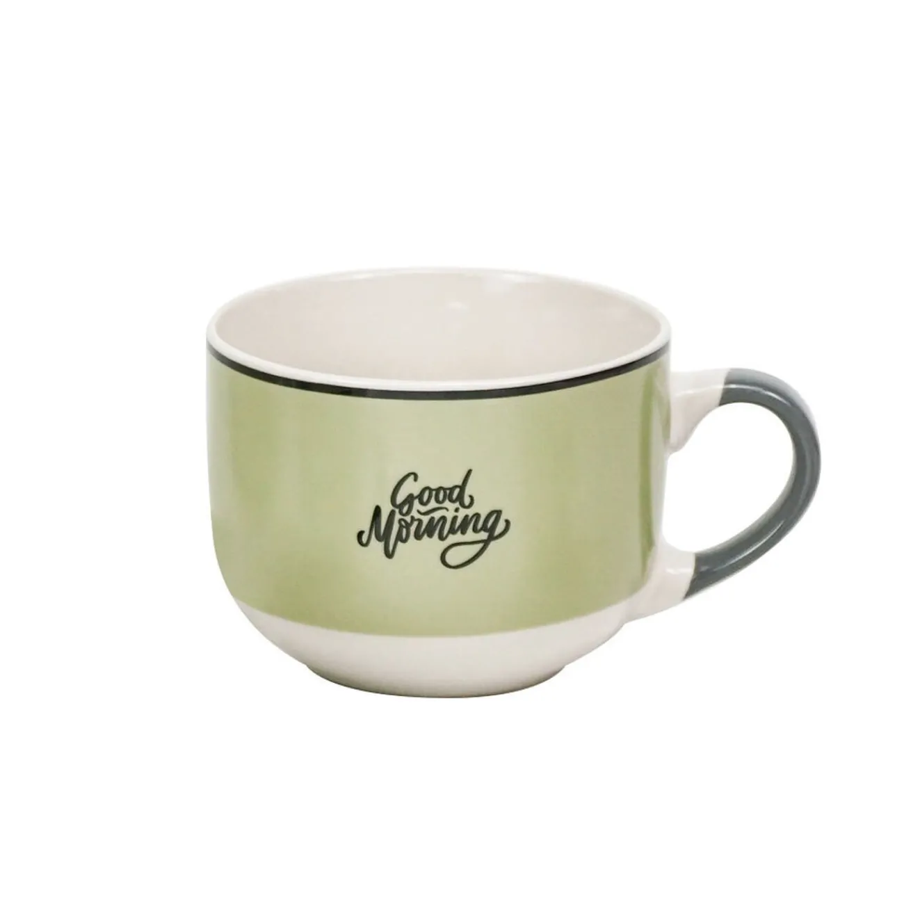 Optez pour cette maxi tasse avec inscription « Good Morning » sur fond uni vert pour vos petits-déjeuners. Idéal pour se réveiller en douceur avec un message personnalisé!