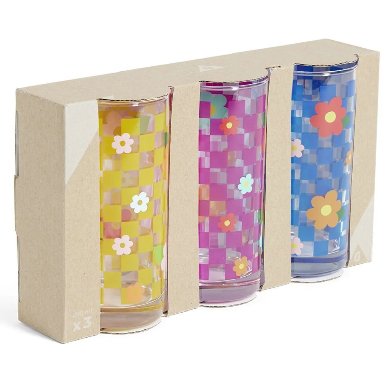 Ce lot de trois verres de 290ml à motif de fleurs et carreaux est parfait pour ajouter une touche de fraîcheur à votre table au quotidien.