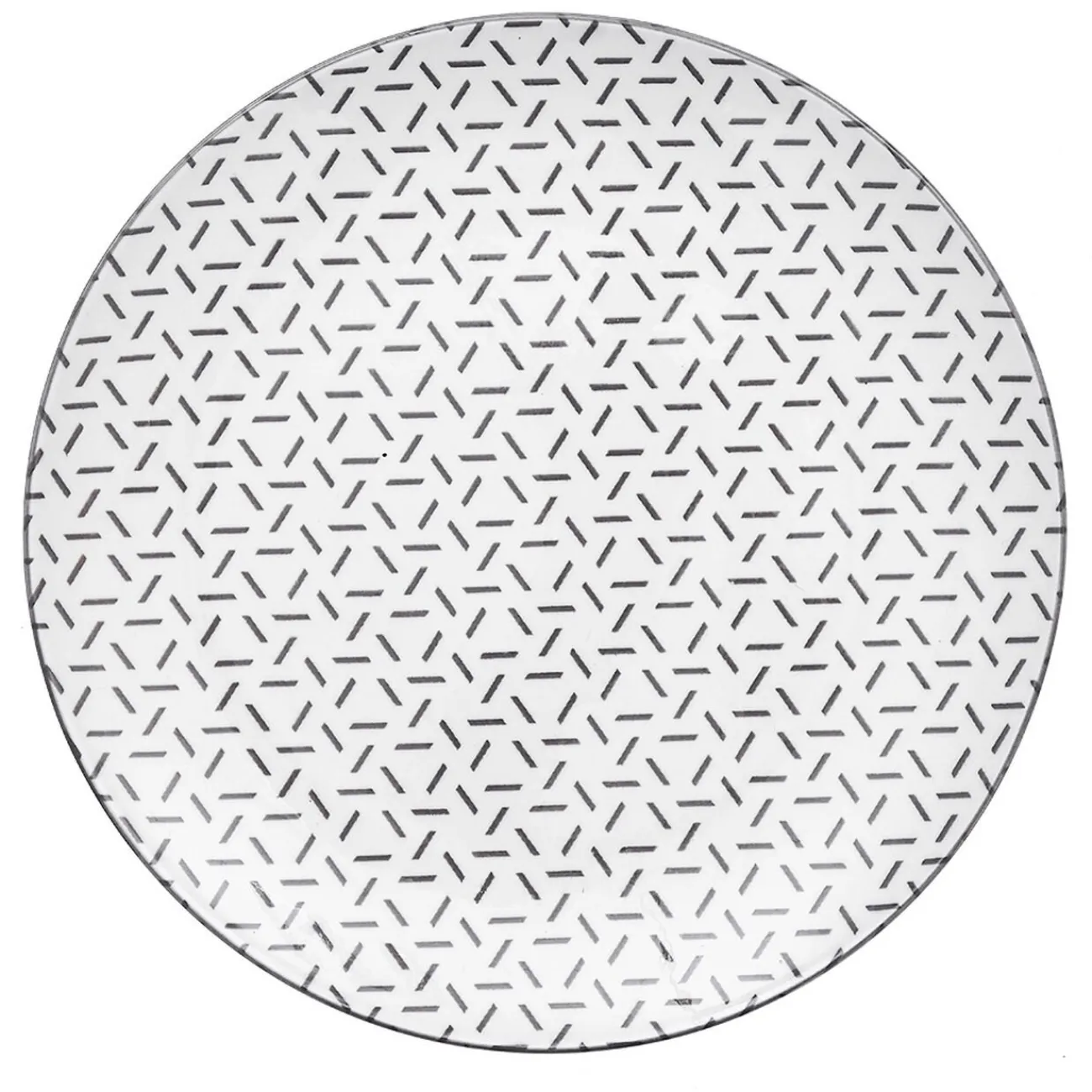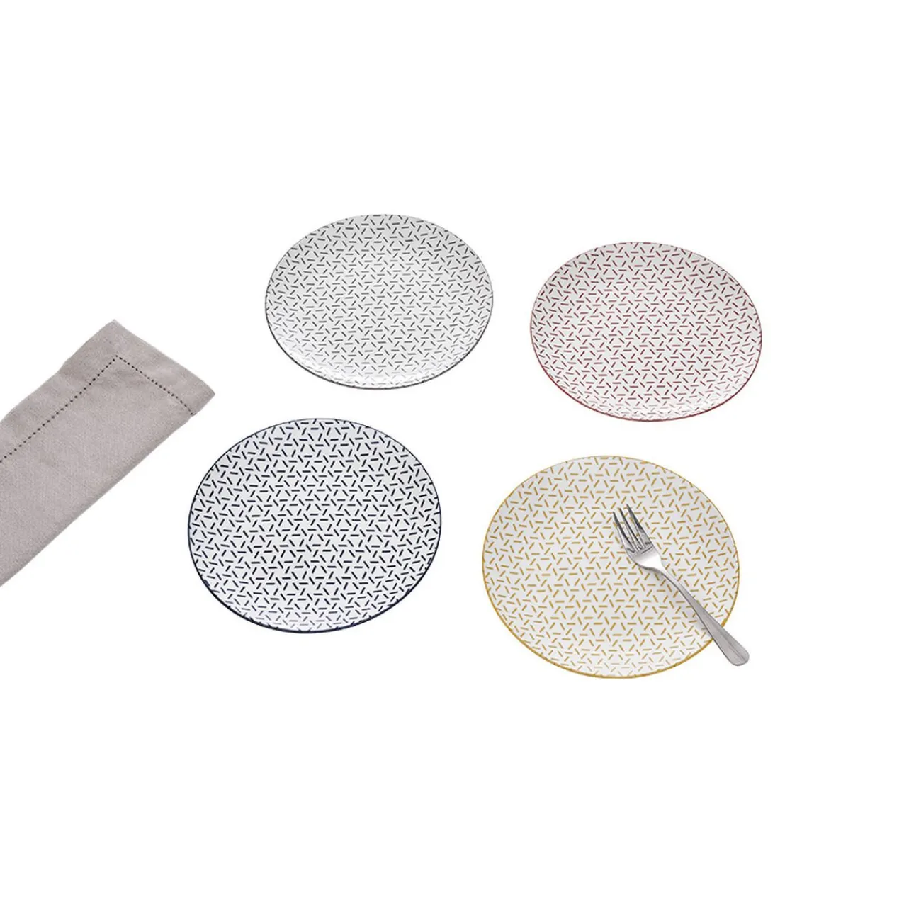 Set de 4 assiettes à dessert en porcelaine blanche avec contour et motifs petits traits colorés formant des triangles, idéal pour créer des mix and match de couleur sur votre table.