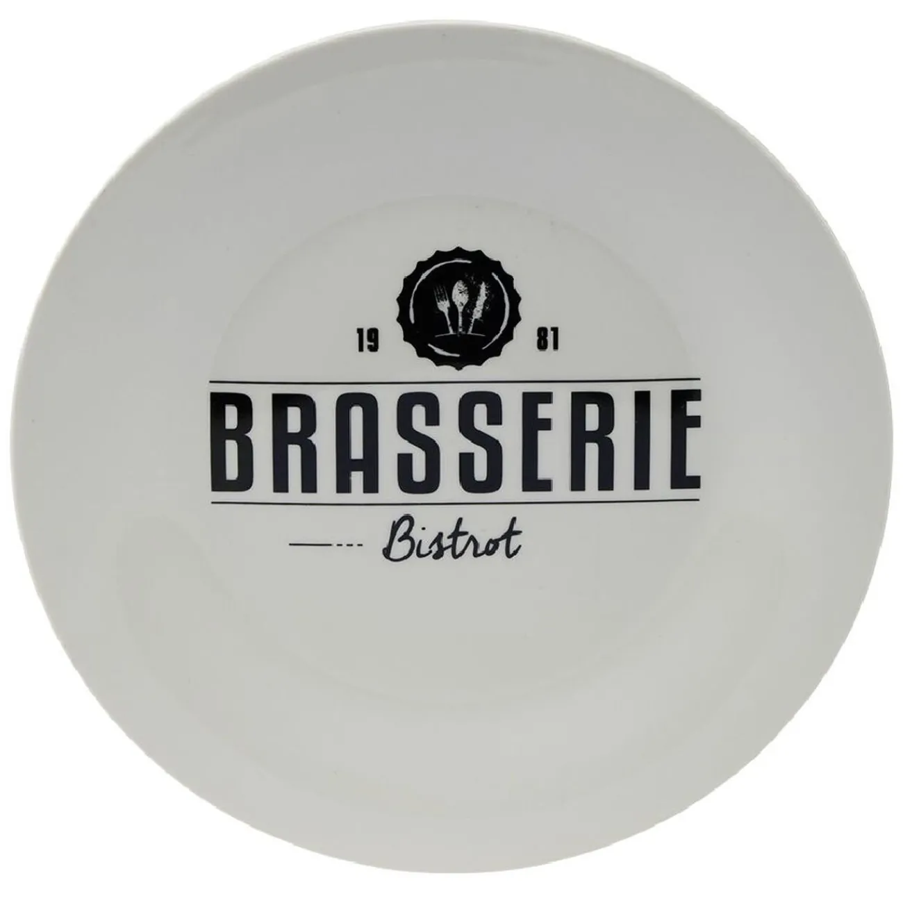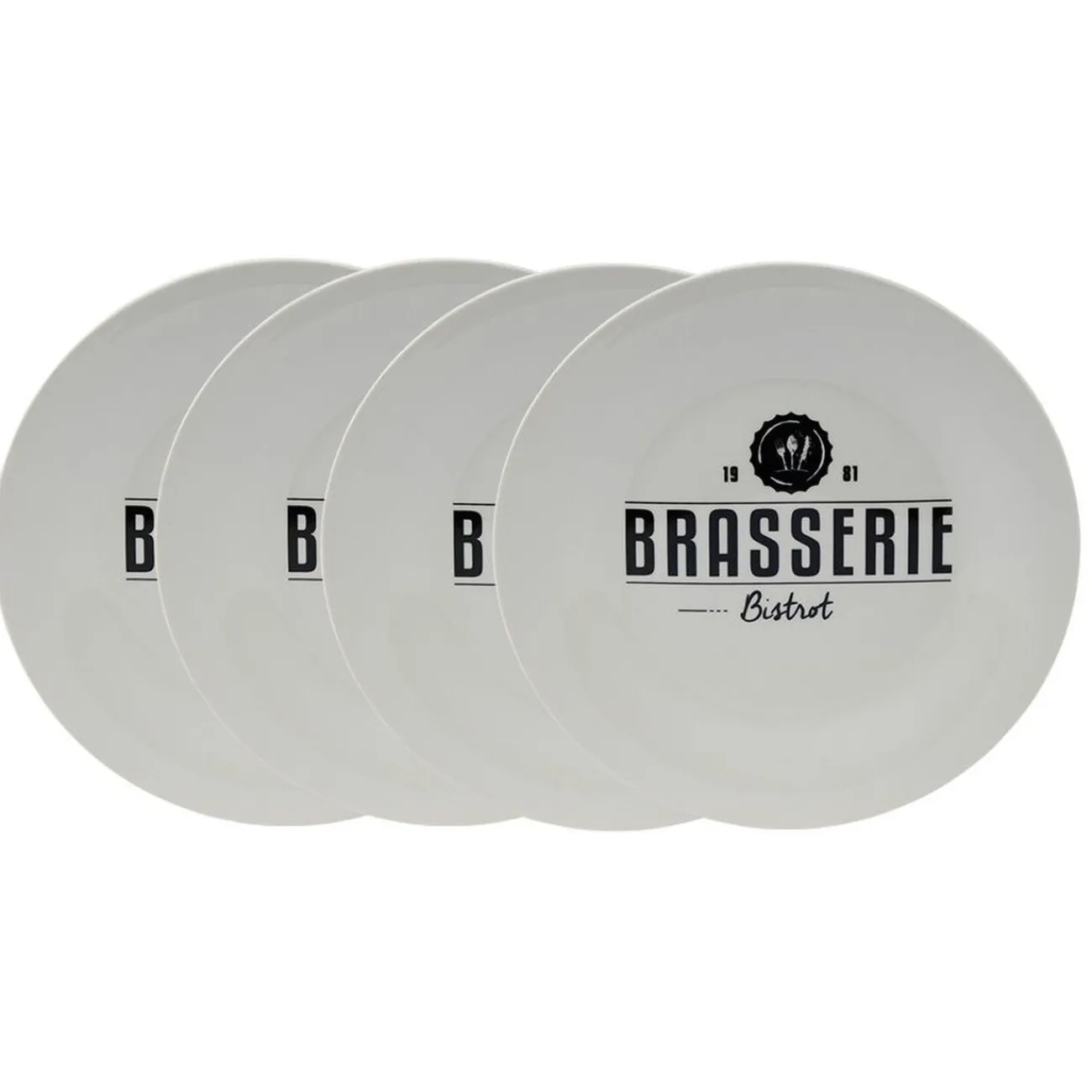 Service de 4 assiettes blanches design « Brasserie Bistrot » avec inscription et motifs noirs assortis.