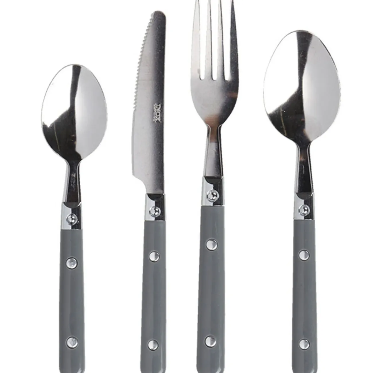 Ménagère 16 pièces gris comprenant 4 fourchettes, 4 cuillères à soupe, 4 couteaux et 4 cuillères à café, inox, manche plastique.