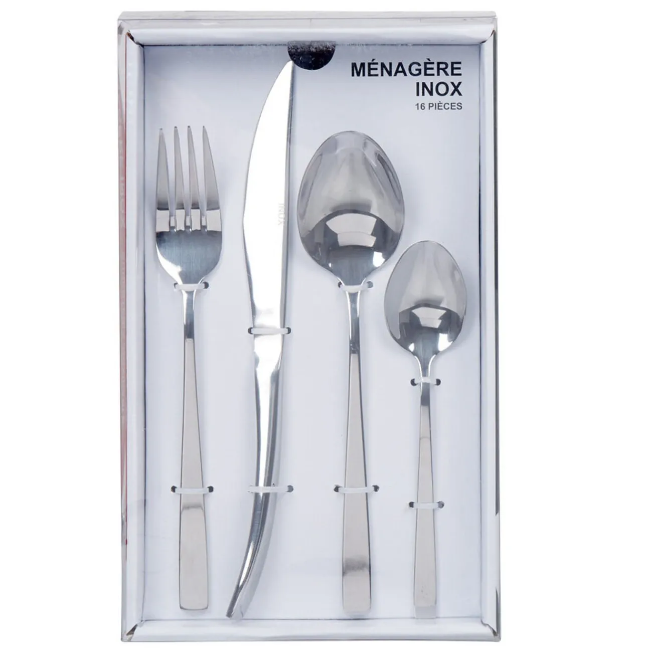 Comprend 4 fourchettes, 4 couteaux, 4 cuillères à soupe et 4 cuillères à café.