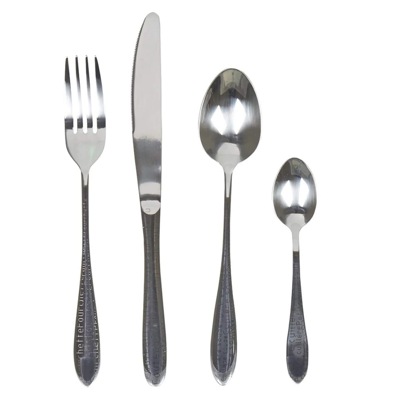 Ajoutez un peu de magie à votre table avec cette ménagère de 24 pièces avec 4 fourchettes, 4 couteaux ronds, 4 grandes cuillères et 4 petites cuillères argentés.