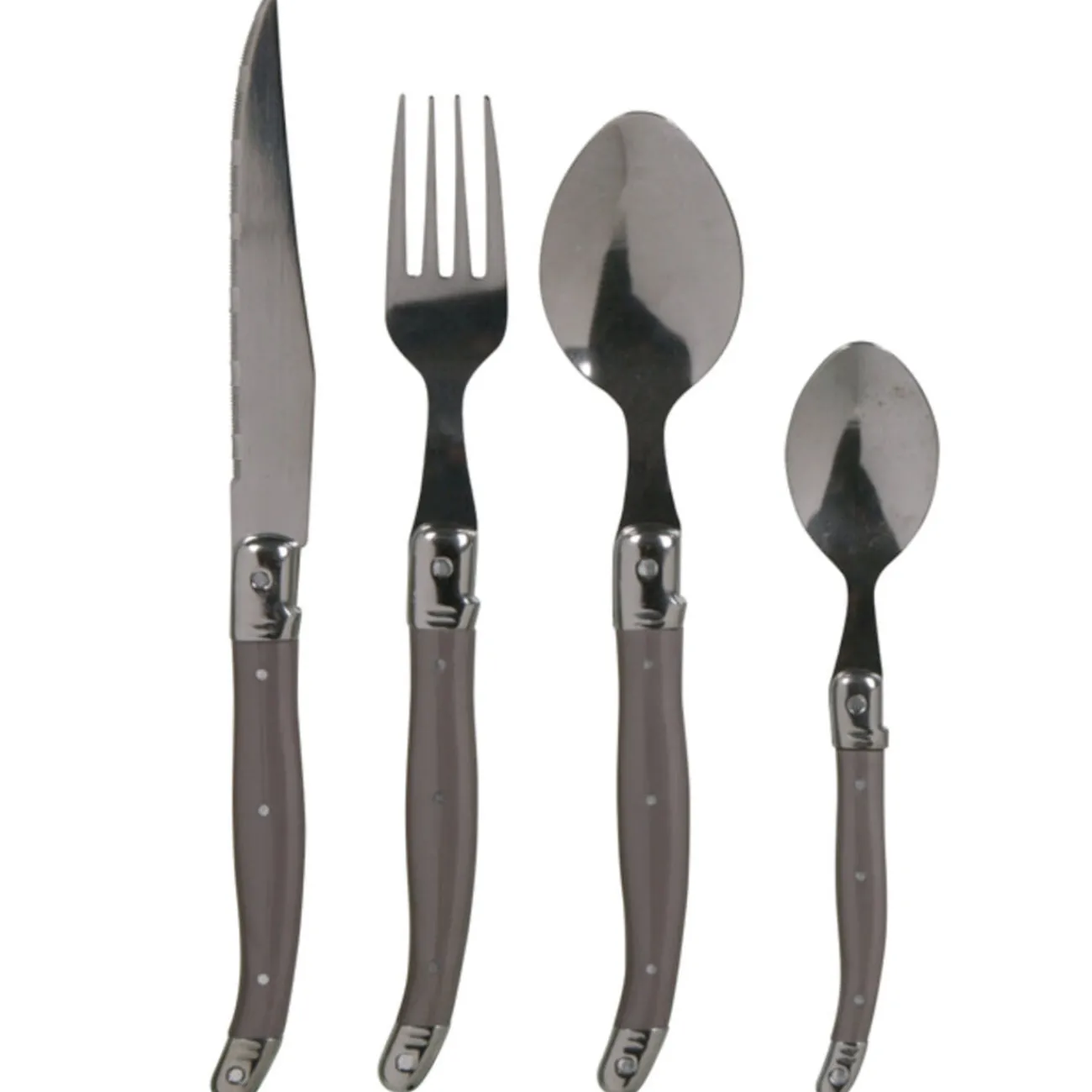 Ménagère 24 pièces taupe Muranu, manche abs, inox, comprenant 6 fourchettes, 6 couteaux, 6 cuillères à soupe et 6 cuillères à café.