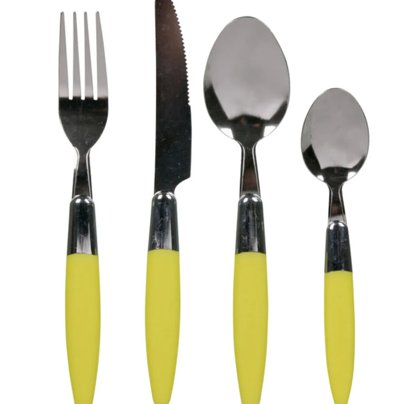 Ménagère 24 pièces verte, inox, comprenant 6 fourchettes, 6 couteaux, 6 cuillères à soupe et 6 cuillères à café.