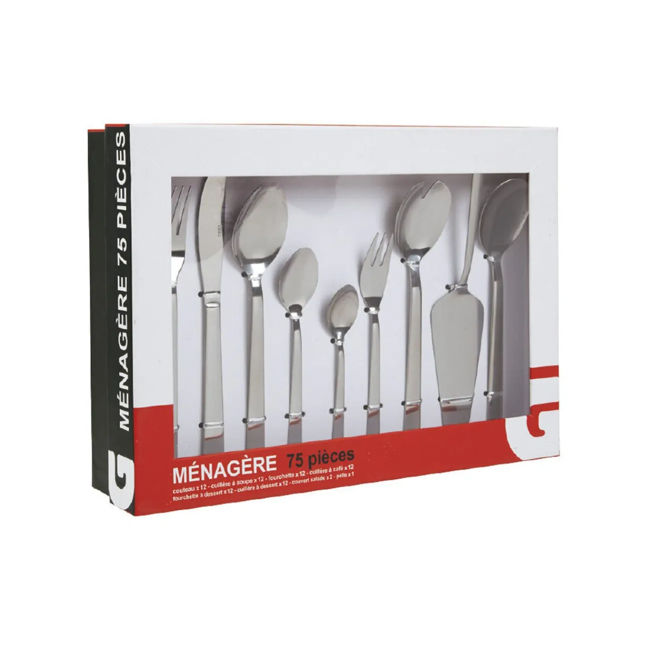 Ménagère inox 75 pièces comprenant : 12 couteaux,12 cuillères à soupe,12 fourchettes, 12 cuillères à café, 12 fourchettes à dessert, 12 cuillères à dessert, 2 couverts à salade et 1 pelle.