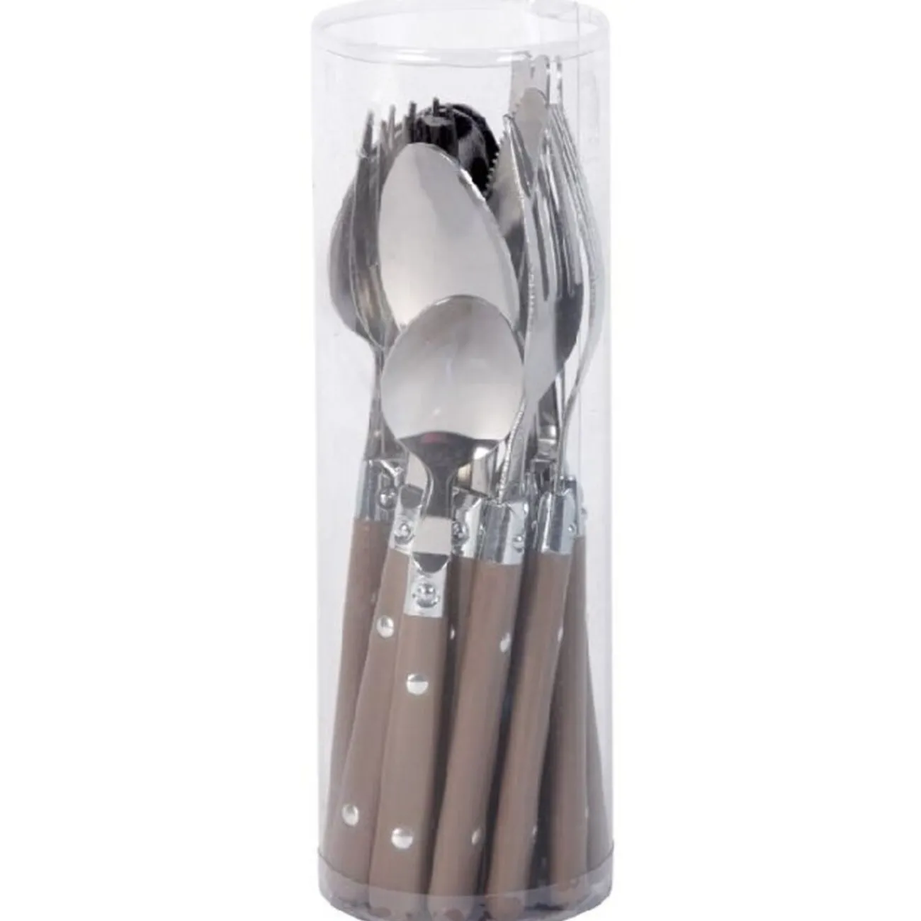 Ménagère 16 pièces taupe comprenant 4 fourchettes, 4 cuillères à soupe, 4 couteaux et 4 cuillères à café, inox, manche plastique.