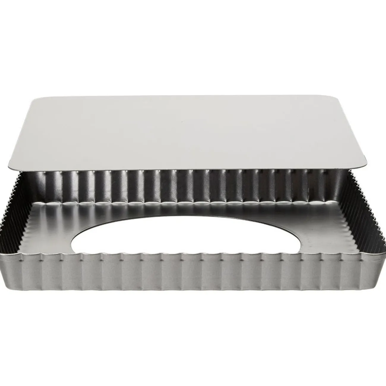 Moule à pâtisserie carré avec fond amovible et revêtement anti-adhérent pour un démoulage parfait sans miettes ni effritements.
