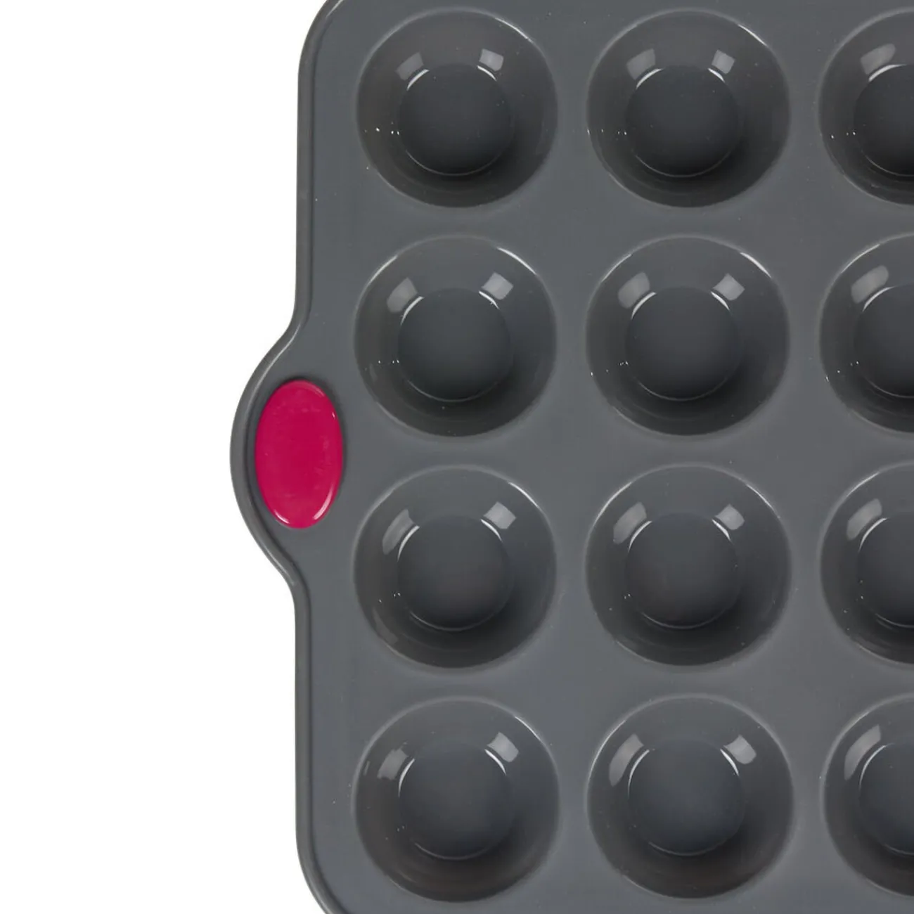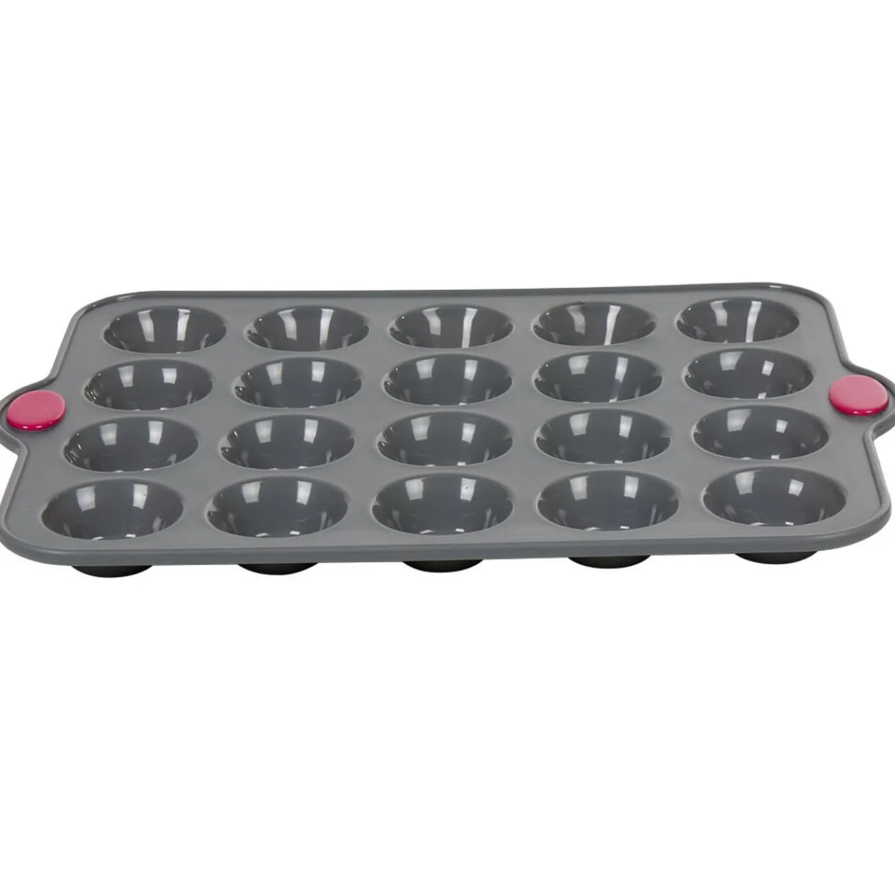Moule en silicone gris pour la cuisson de 20 petits-fours avec armature rigide en acier pour une meilleure stabilité et prise en main.