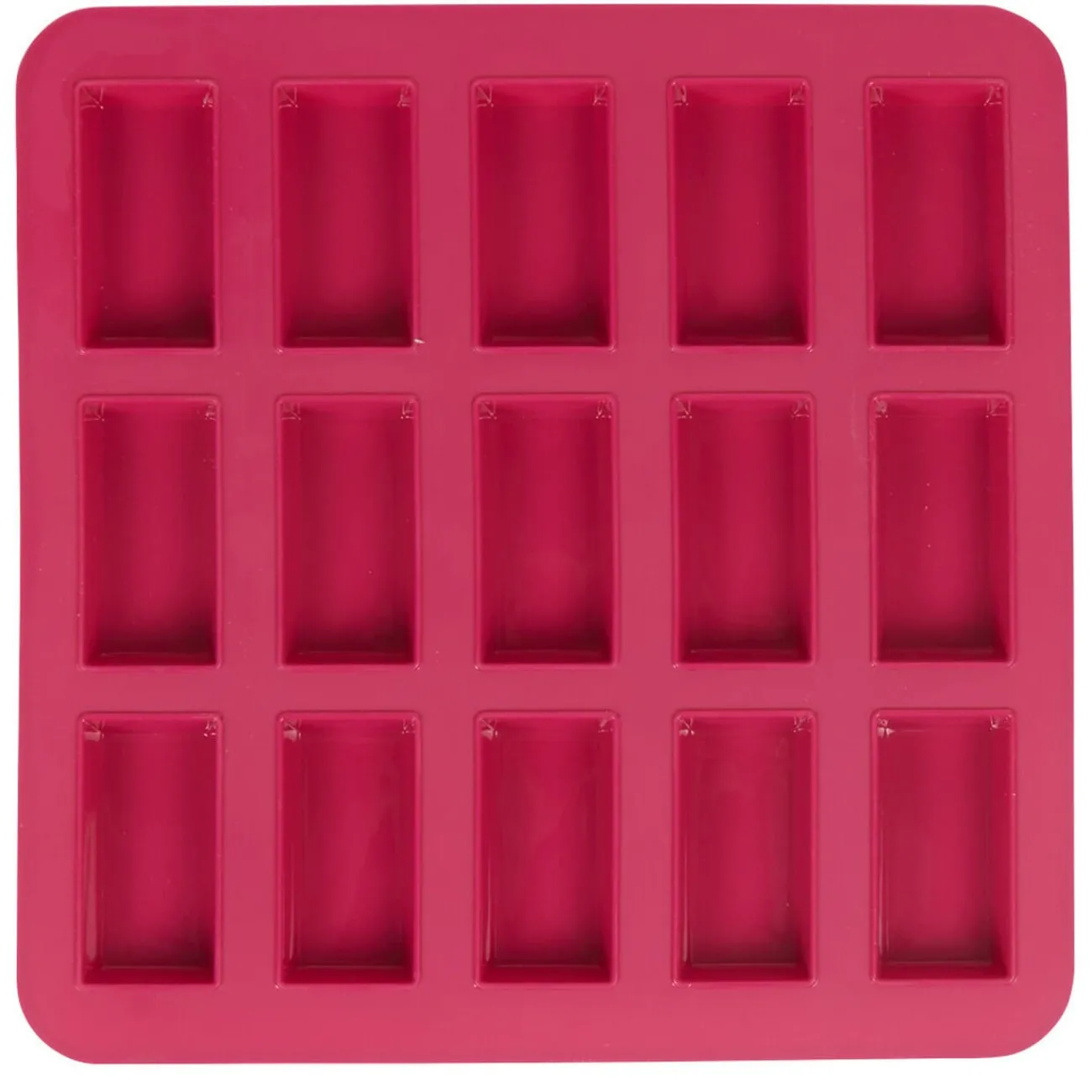Moule carré en silicone de couleur rose avec empreintes pour la cuisson de 15 délicieux financiers.