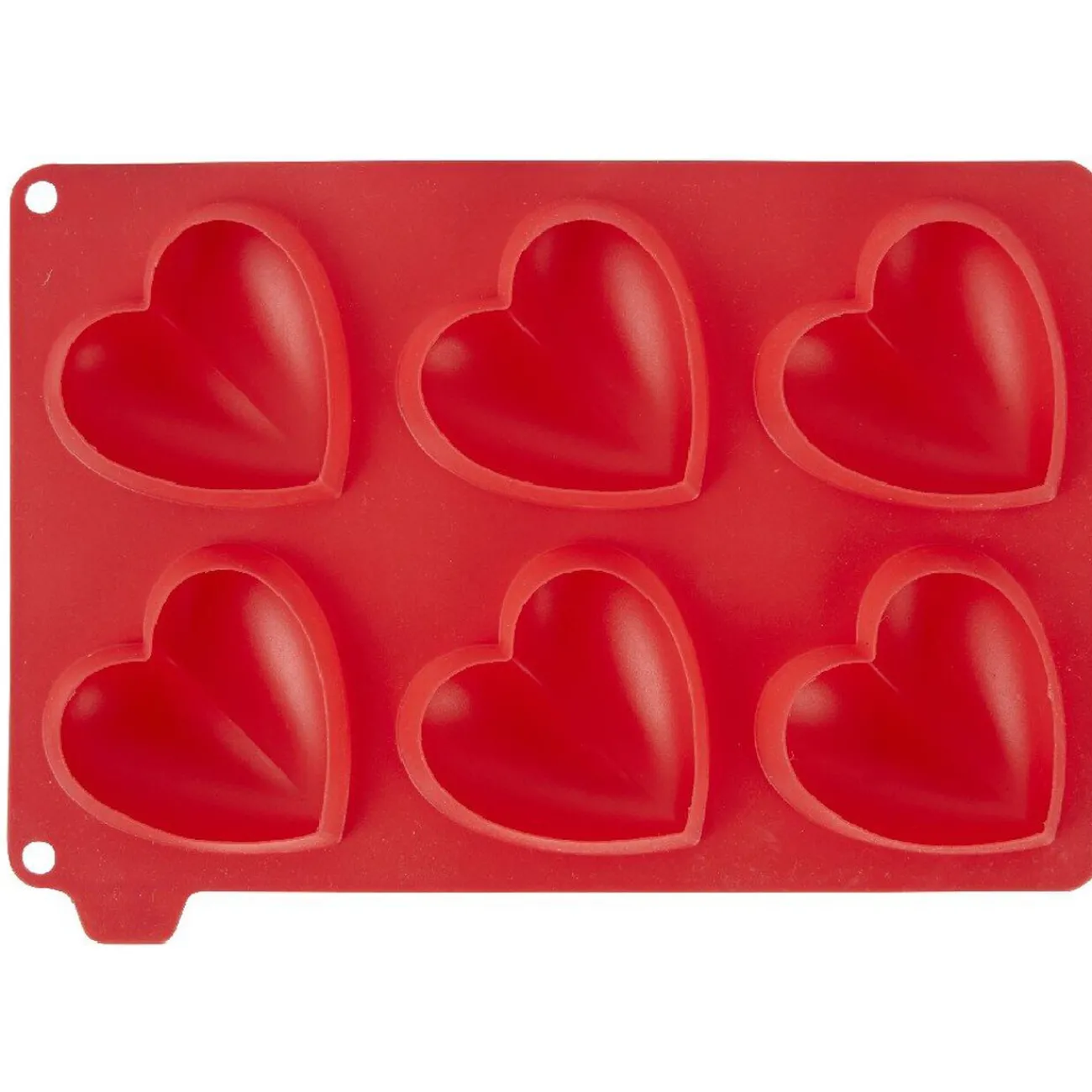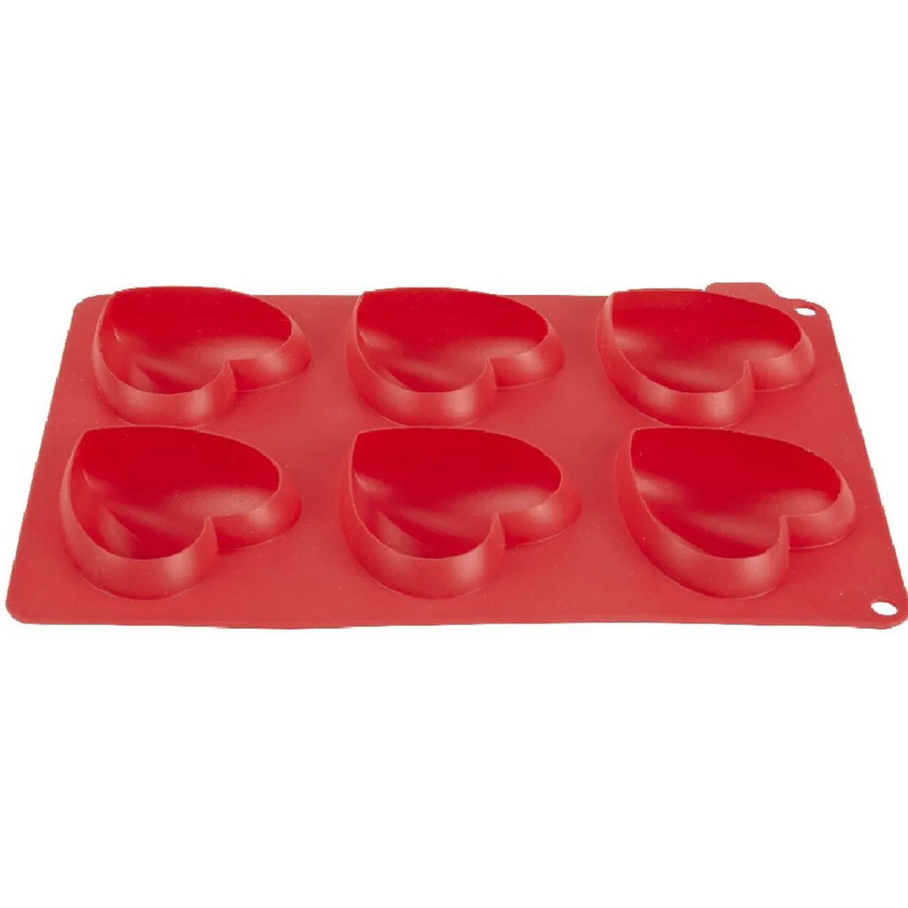 Moule rectangulaire en silicone rouge pour la cuisson de 6 pâtisseries individuelles en forme de coeur.