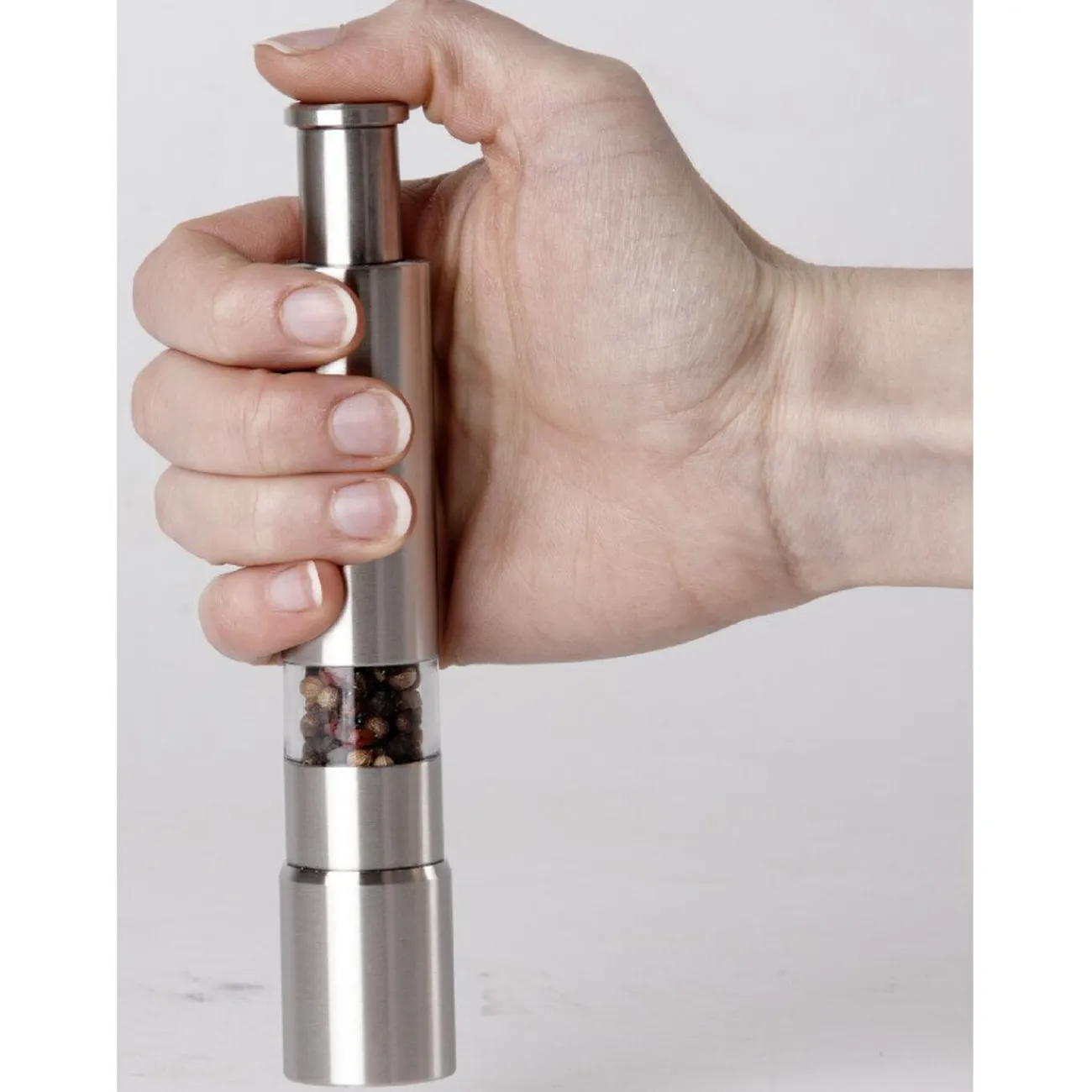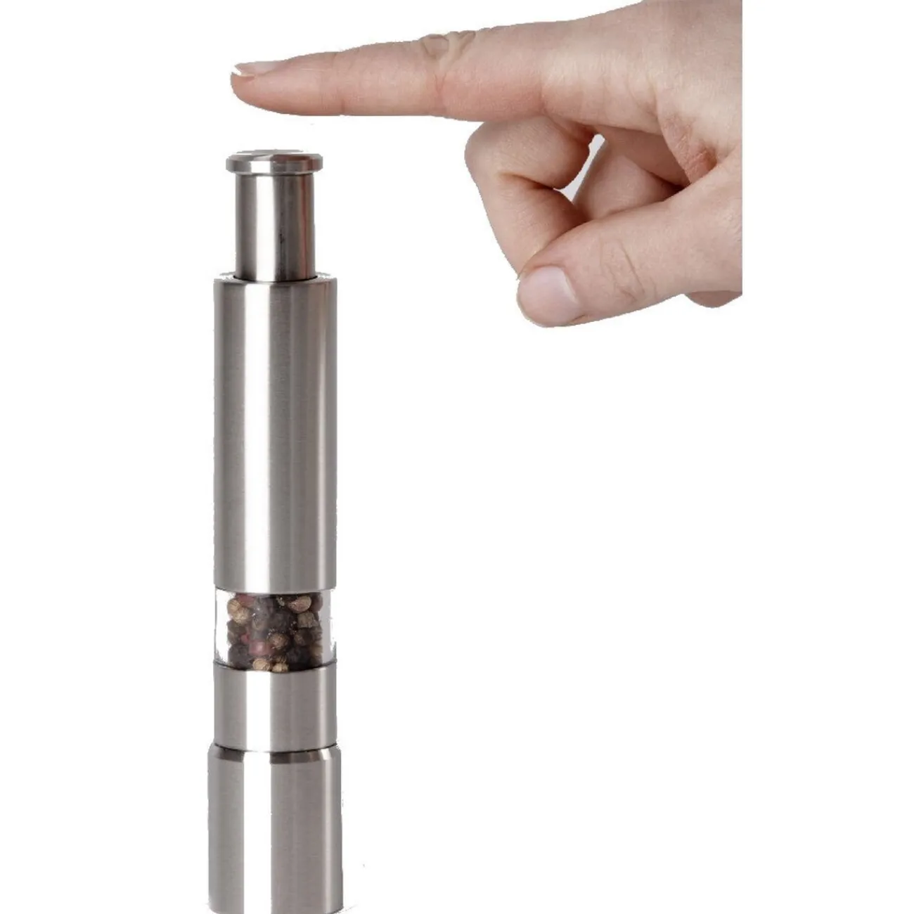 Moulin à poivre gris avec système de broyage à piston, dim. Ø2,5xh.15 cm, inox. Une simple pression sur le bouton déclenche la meule qui concasse les grains.