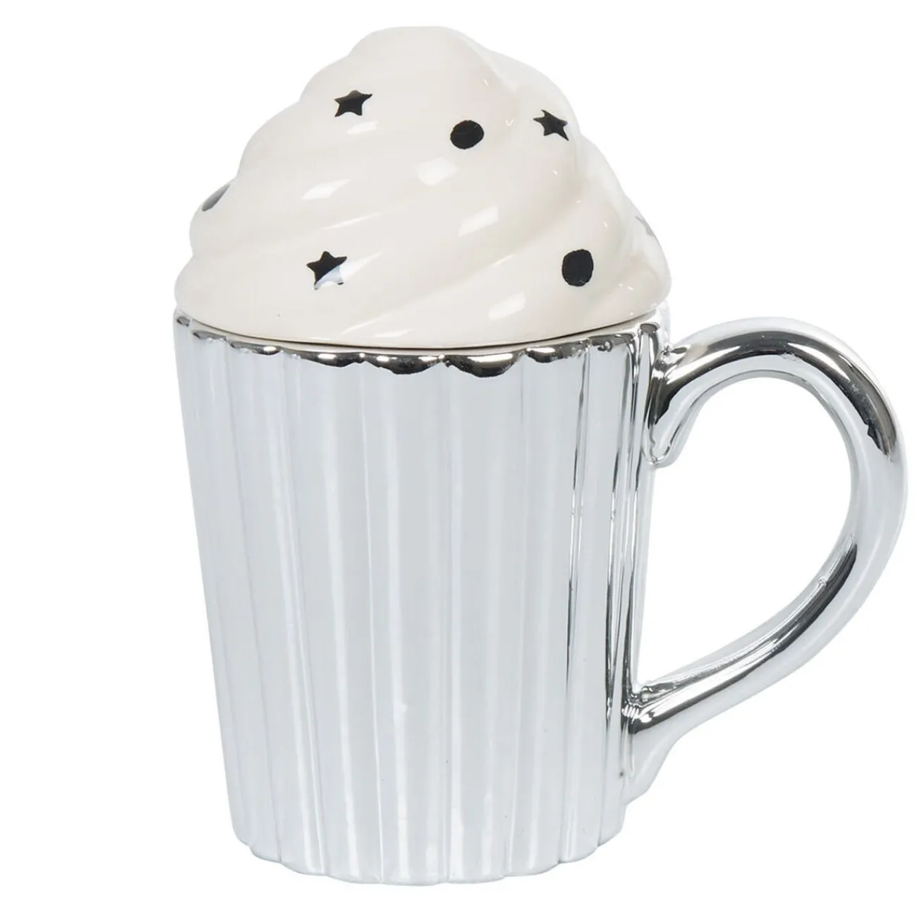 Optez pour ce joli mug en faïence gris argenté avec couvercle blanc design cupcake, idéal pour vos pauses douceur.