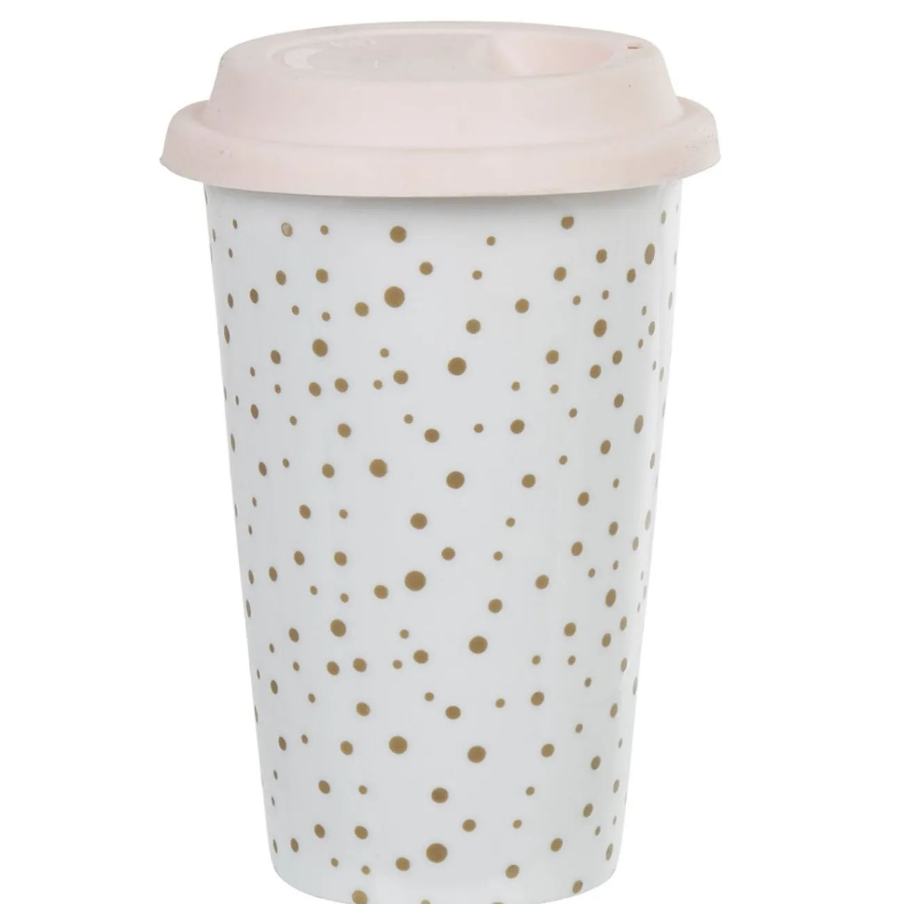 Si vous manquez de temps le matin, ce mug de transport blanc aux pois dorés est fait pour vous. Avec son design sympathique et épuré, il sera très pratique pour déguster votre café ou votre chocolat chaud dans les transports en commun ou dans votre voiture. Refermez-le facilement et n’ayez pas peur des fuite grâce à son couvercle en silicone qui épousera parfaitement la forme du gobelet. Pensez-y aussi lors d’un pique-nique, d’une longue réunion ou d’une sortie à vélo.
