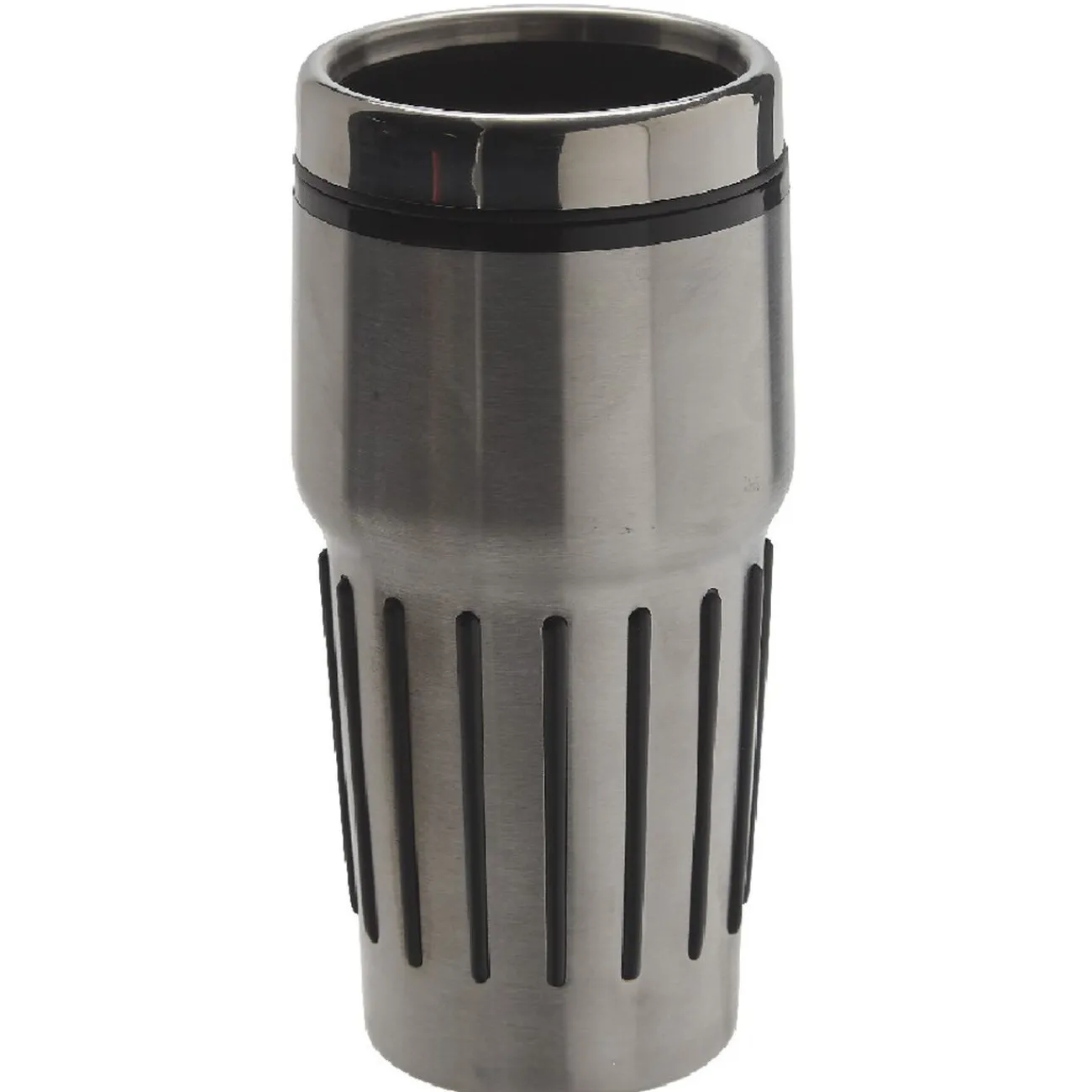 Mug isotherme en inox argenté et noir avec traits siliconés sur tout le contour pour une meilleure prise en main. Très pratique, d’une contenance de 450 ml, emportez partout avec vous votre boisson et conservez toute sa fraîcheur ou chaleur.