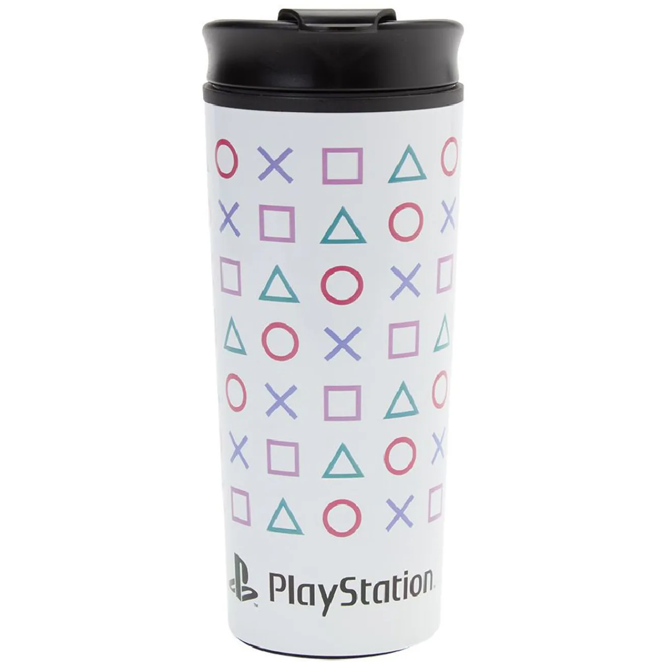 Mug de voyage en acier motif Playstation, idéal pour transporter vos liquides chauds en toute sécurité et pour longtemps.