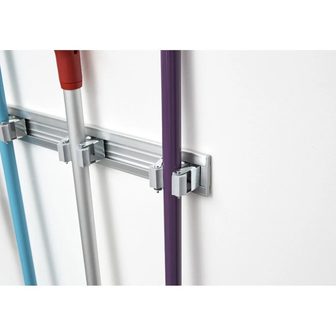 Support mural pour manches à balais comprenant 4 accroches réglables en fonction de la largeur du balai.