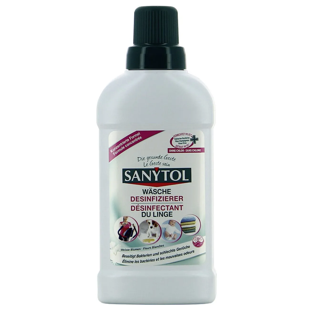 Le désinfectant SANYTOL pour linge élimine bactéries, candida albicans, virus H1N1, Coronavirus humain 229 E et COVID-19 (SARS-CoV-2 selon EN14476) même à basse température.
