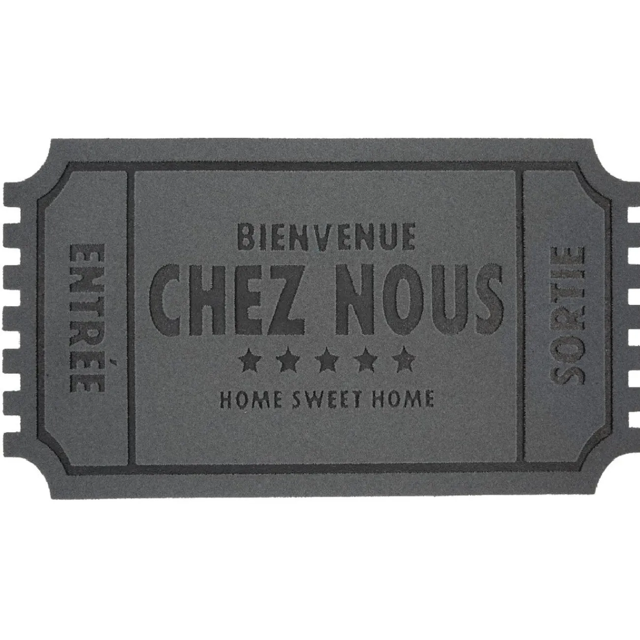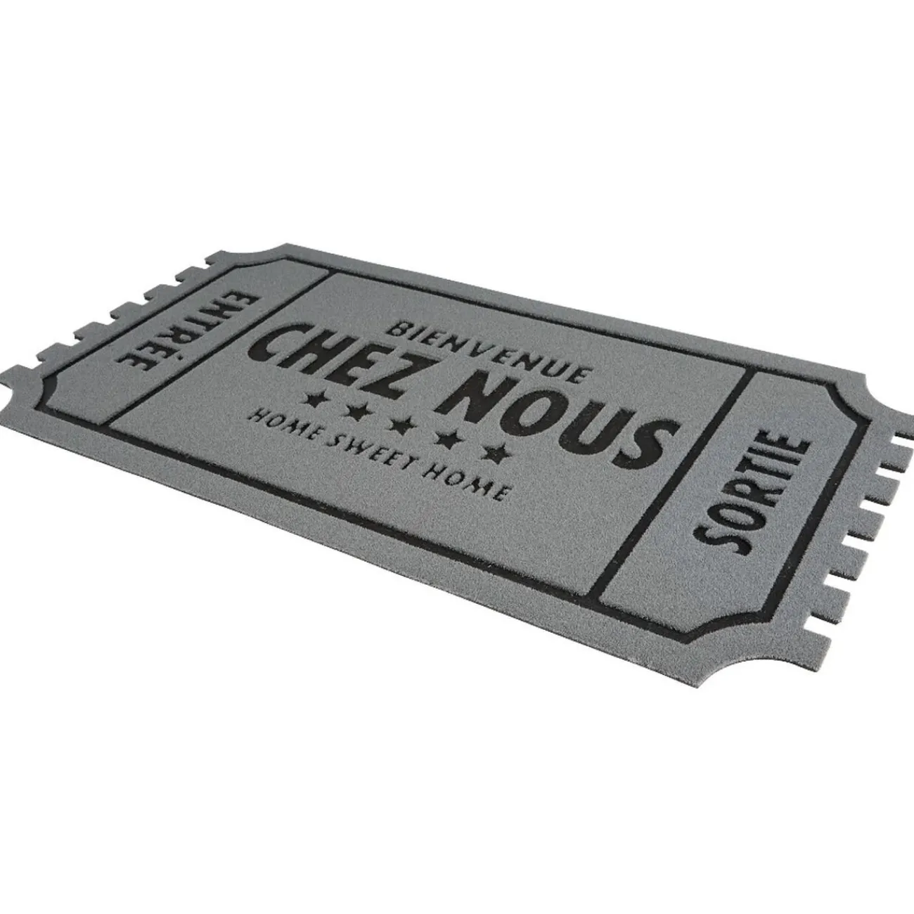 Paillasson gris et noir en forme de ticket avec inscription « bienvenue chez nous ».