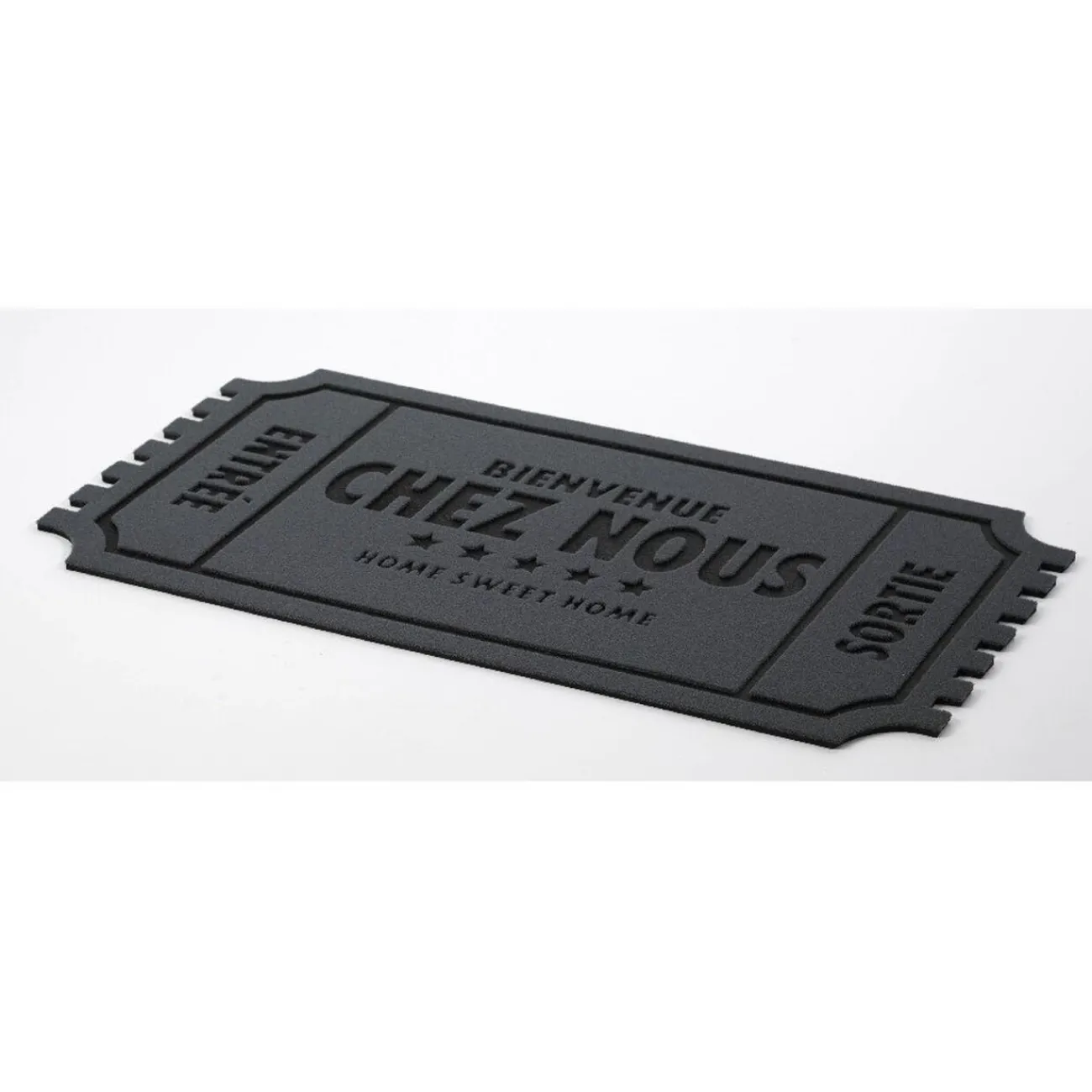 Paillasson gris et noir en forme de ticket avec inscription « bienvenue chez nous ».
