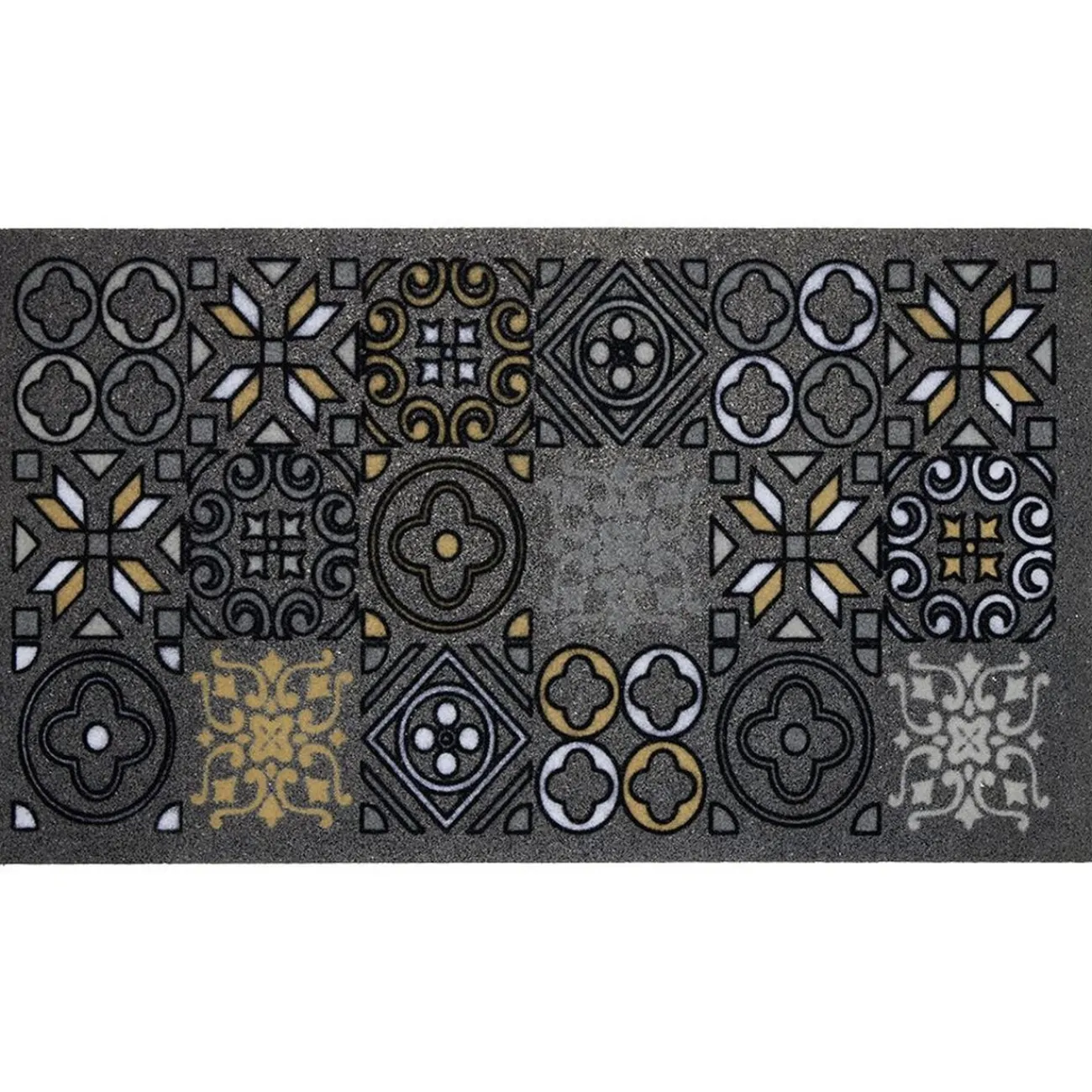 Paillasson rectangulaire grattant en polyester noir design carreau de ciment. Idéal pour décorer le seuil de la porte d’entrée, il est doté d’un revers en caoutchouc antidérapant afin qu’il ne glisse pas en s’essuyant les pieds.