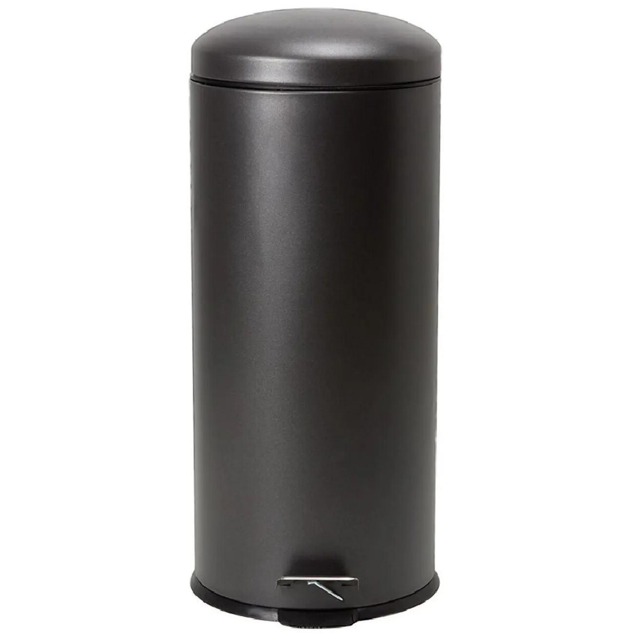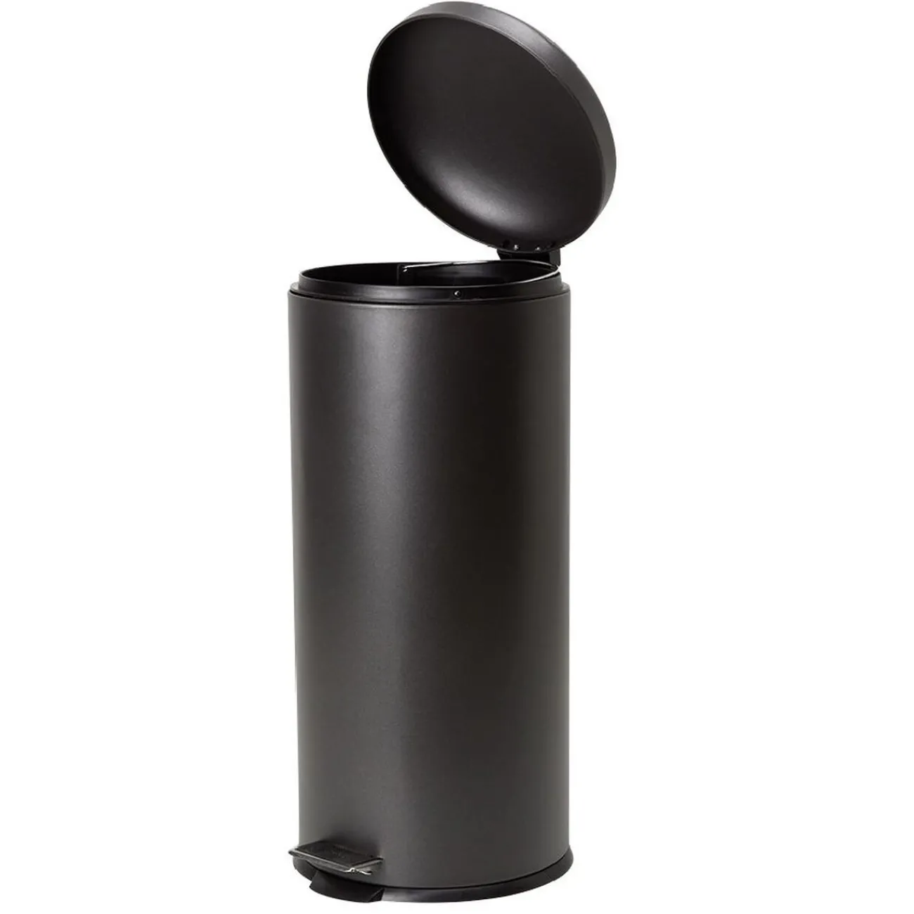 Poubelle en métal noir avec système d’ouverture à pédale pour jeter les ordures en un seul geste et frein de chute pour la fermeture du couvercle en douceur.