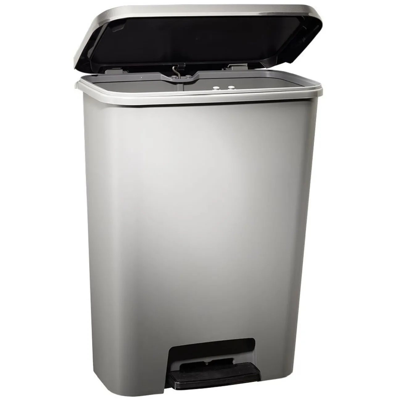 Poubelle de cuisine en plastique gris avec couvercle noir et ouverture à pédale.
