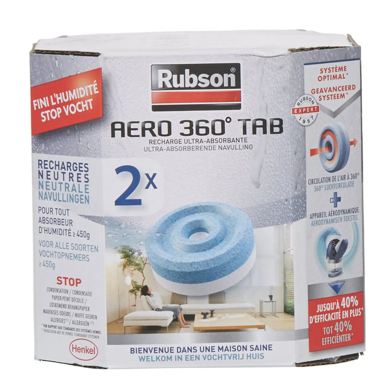 Ce pack de 2 recharges est spécialement conçu pour l’absorbeur d’humidité Rubson Aero 360° vendu sous la référence 500758.