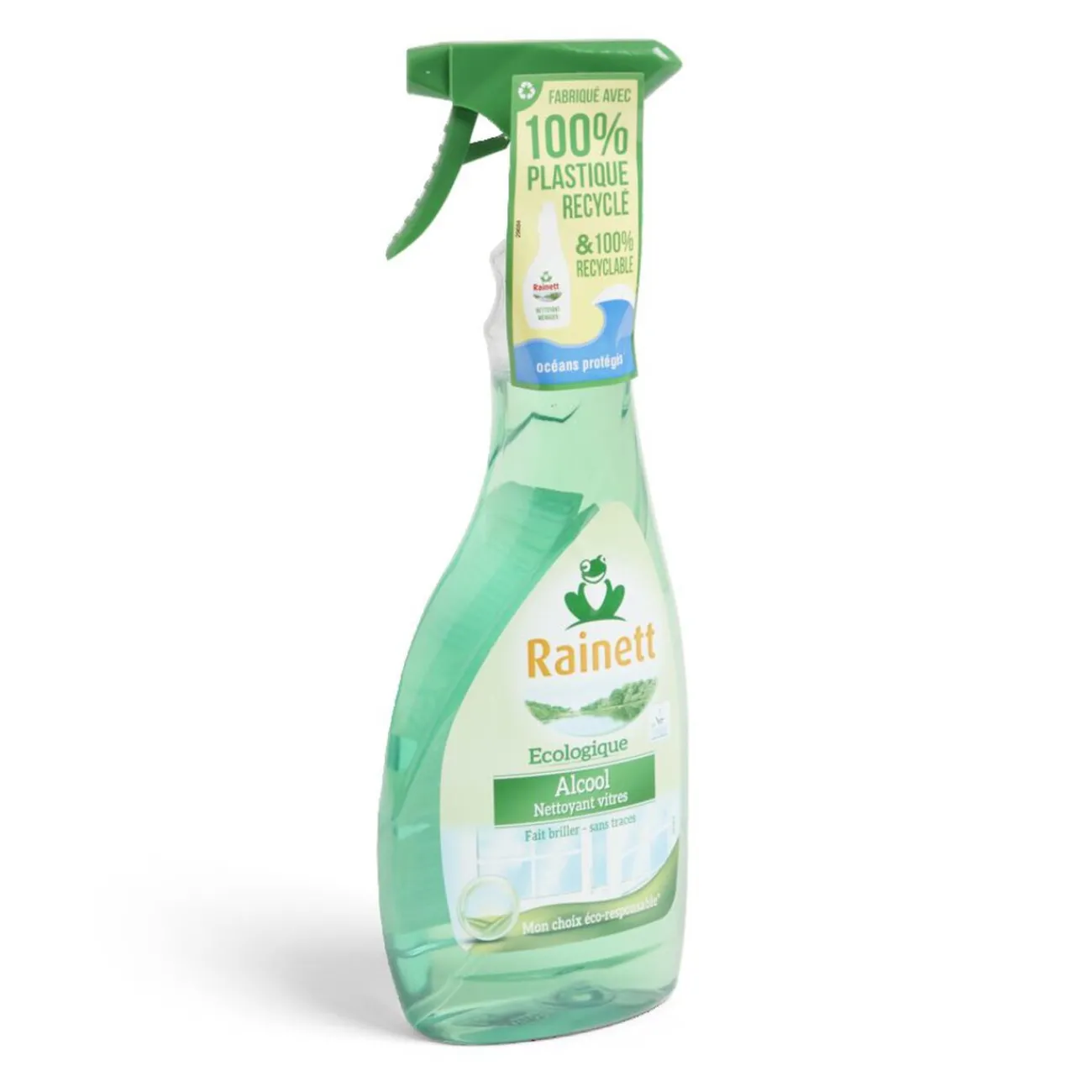 Pour des vitres éclatantes, ce spray nettoyant Rainett de 500 ml sera parfait. Sa formule naturellement efficace à l’alcool dégraisse en profondeur et fait briller sans laisser de traces. Fabriqué avec 100% de plastique recyclé pour un produit éco-responsable.