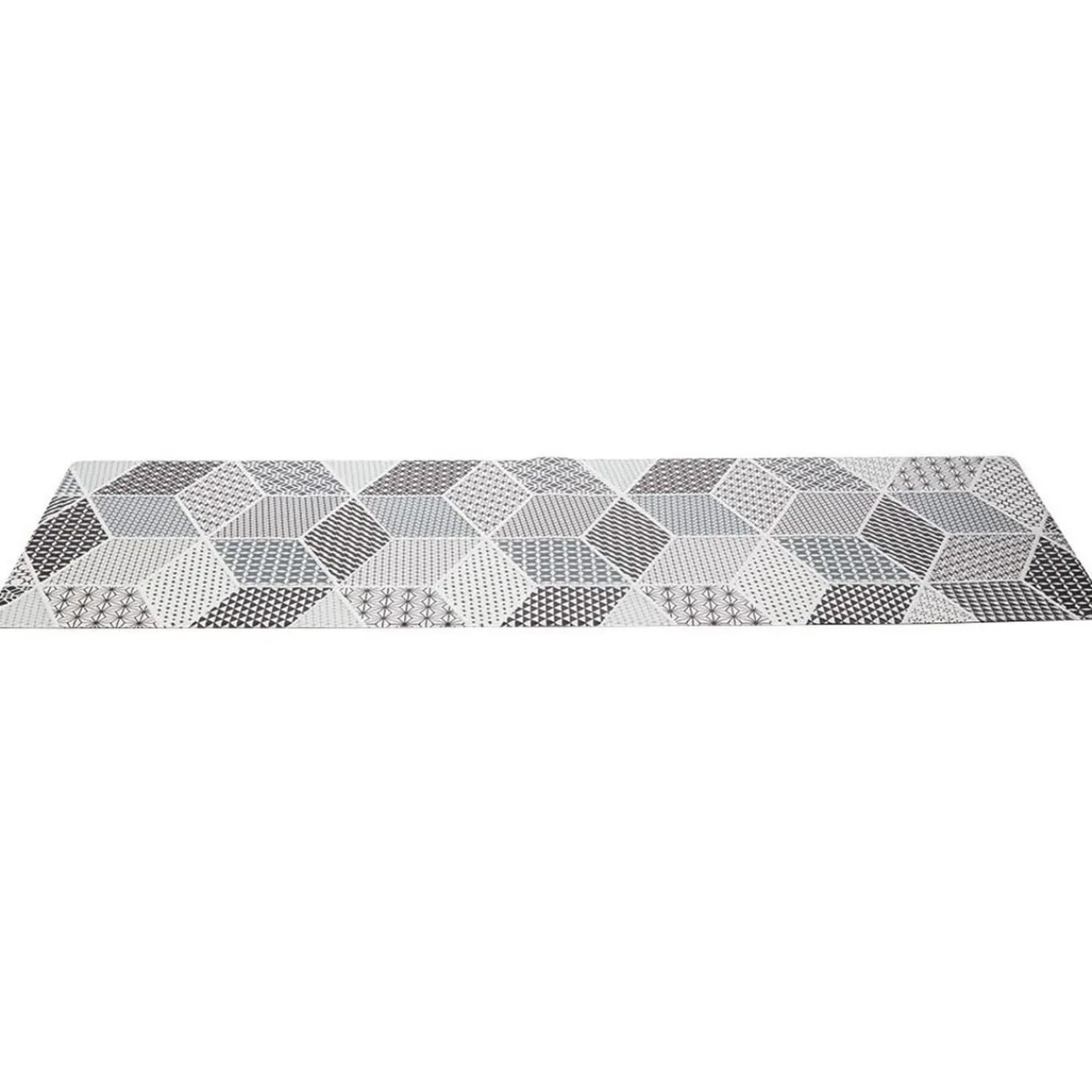 Tapis de cuisine rectangulaire à motif carreau de ciment dans les tons gris et bleu.