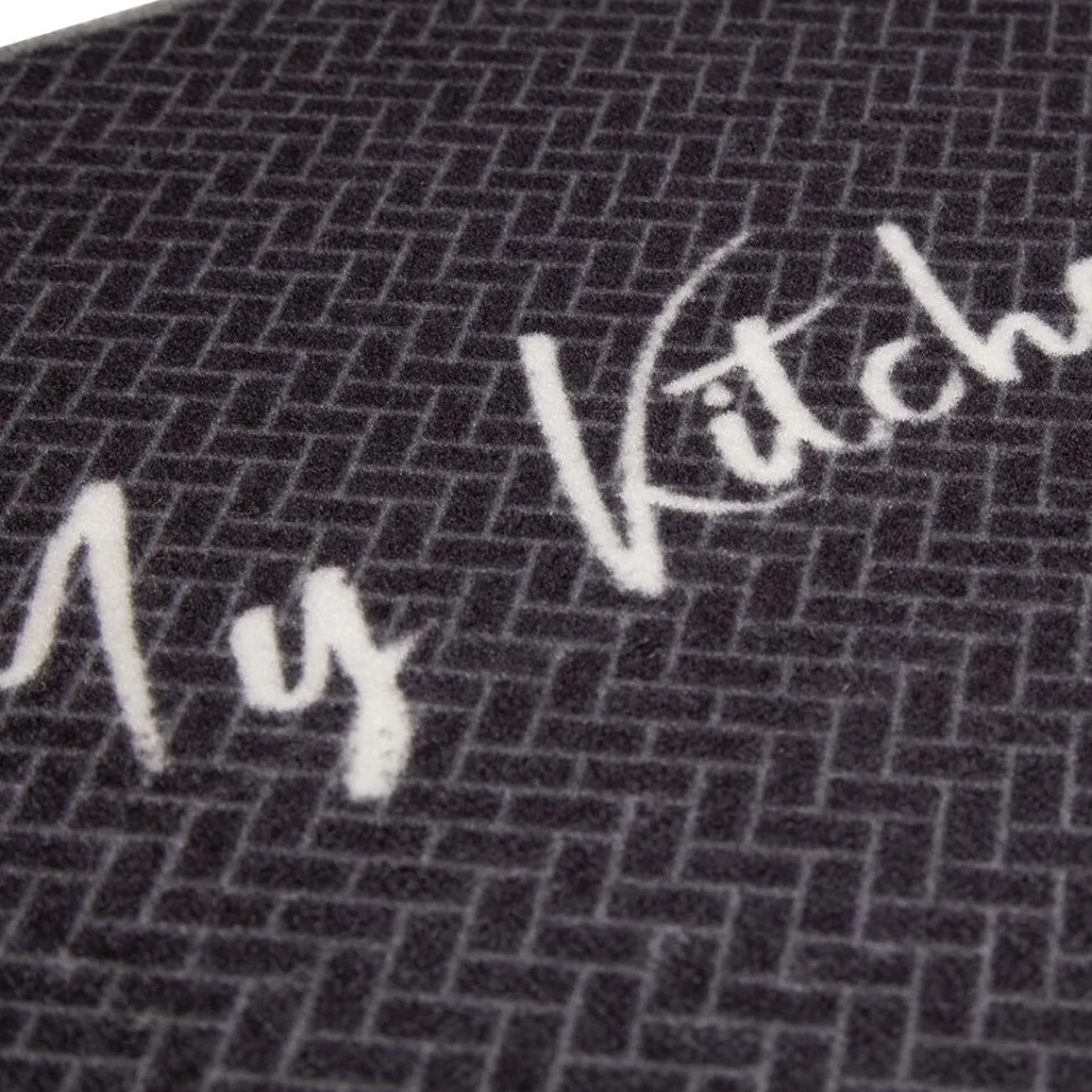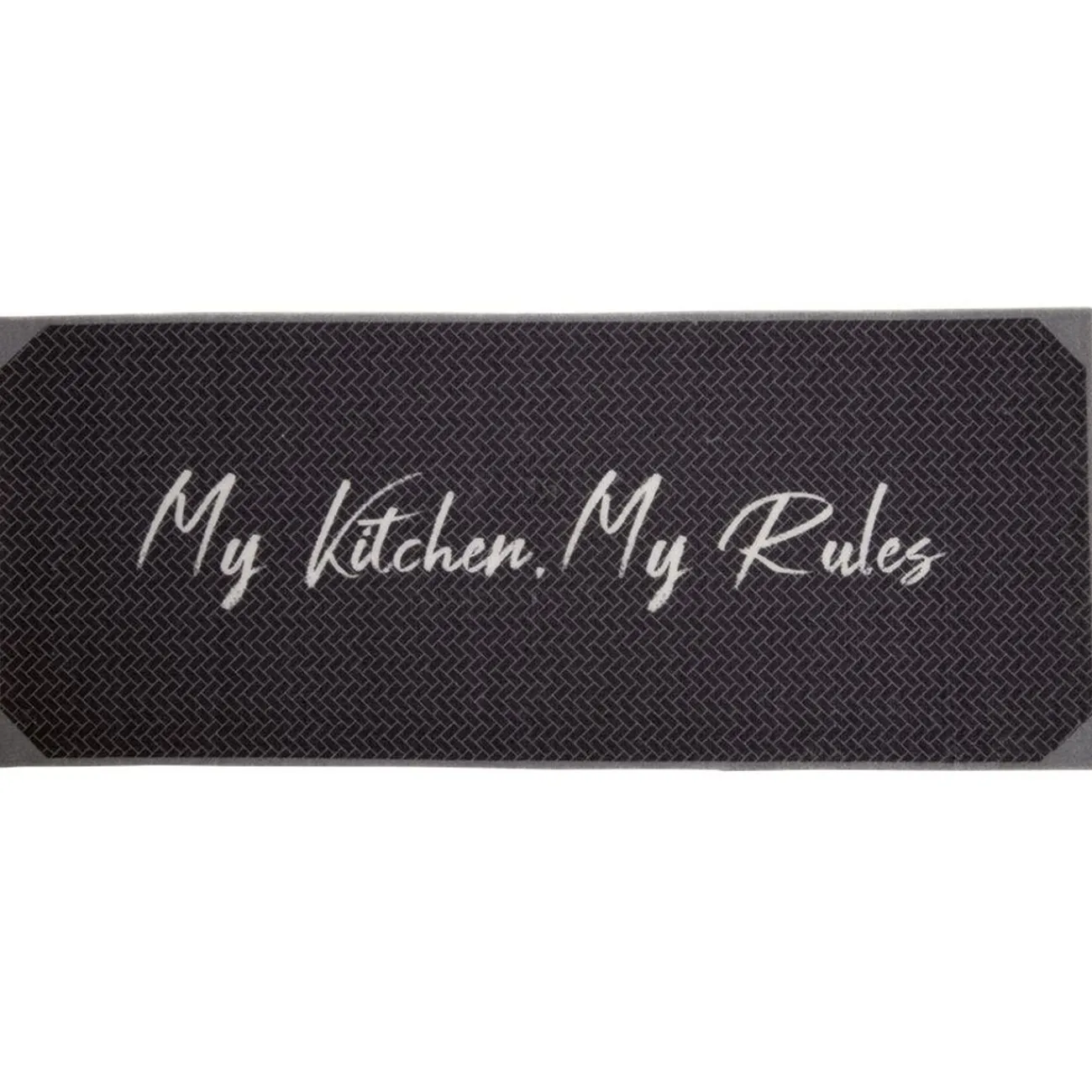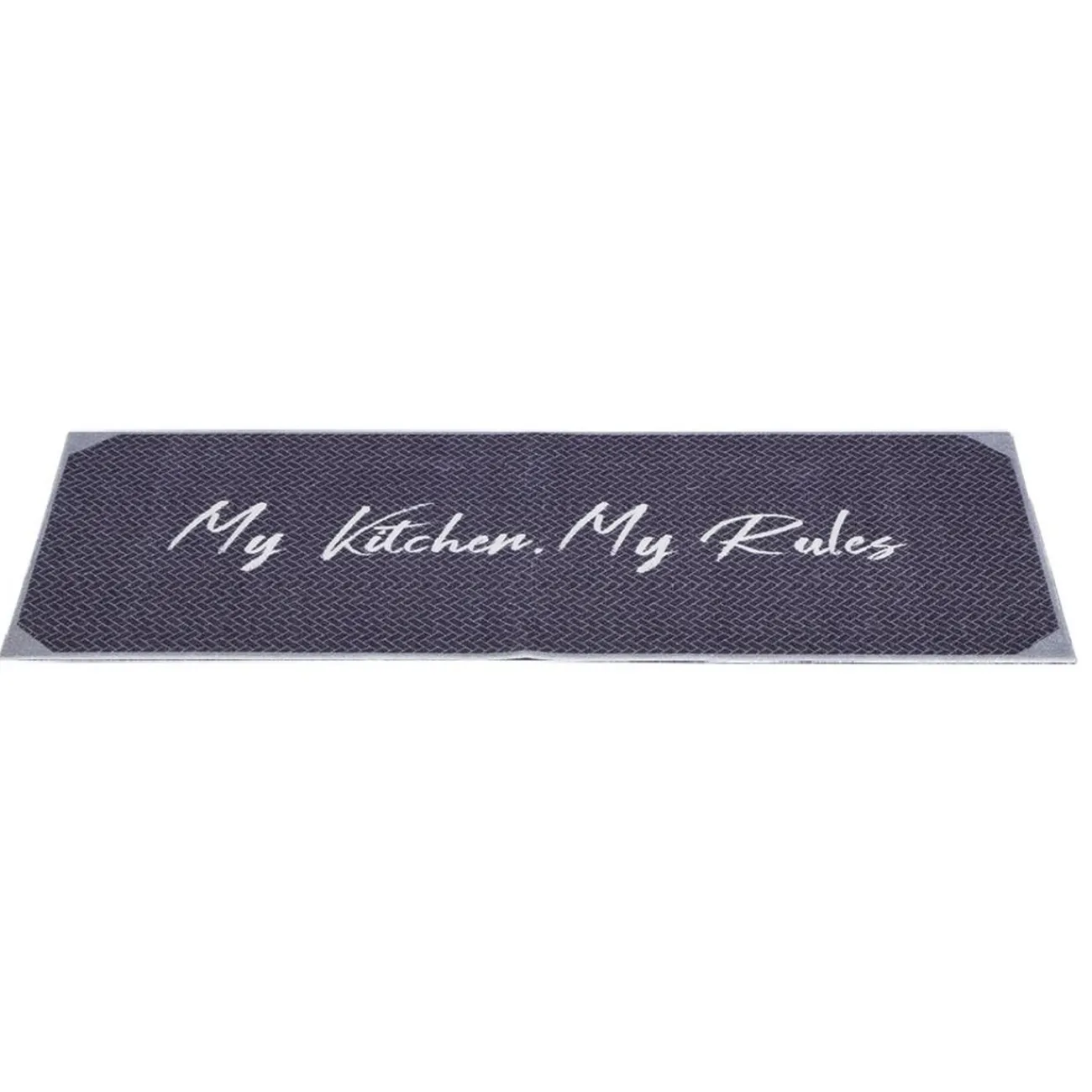 Agrémentez la déco de votre cuisine avec ce tapis de couleur grise et inscription blanche « My Kitchen. My Rules ».