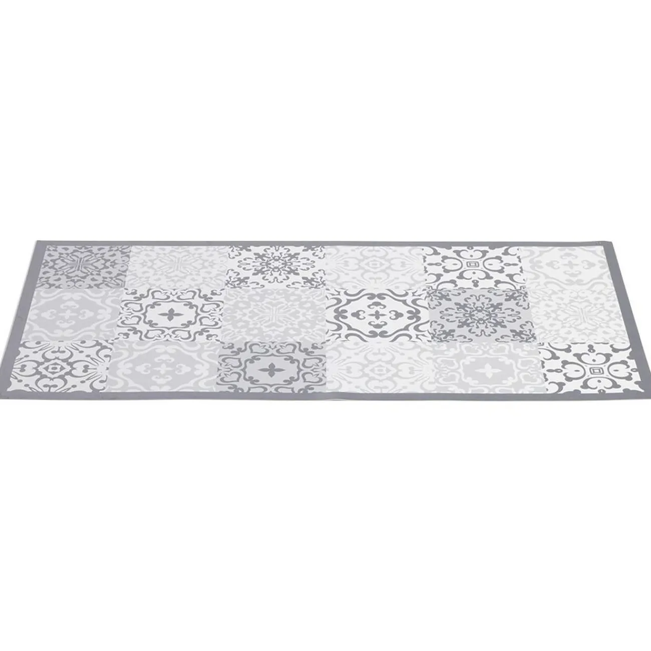 Tapis rectangulaire en vinyle imprimé carreau de ciment dans les tons gris clair et gris foncé.