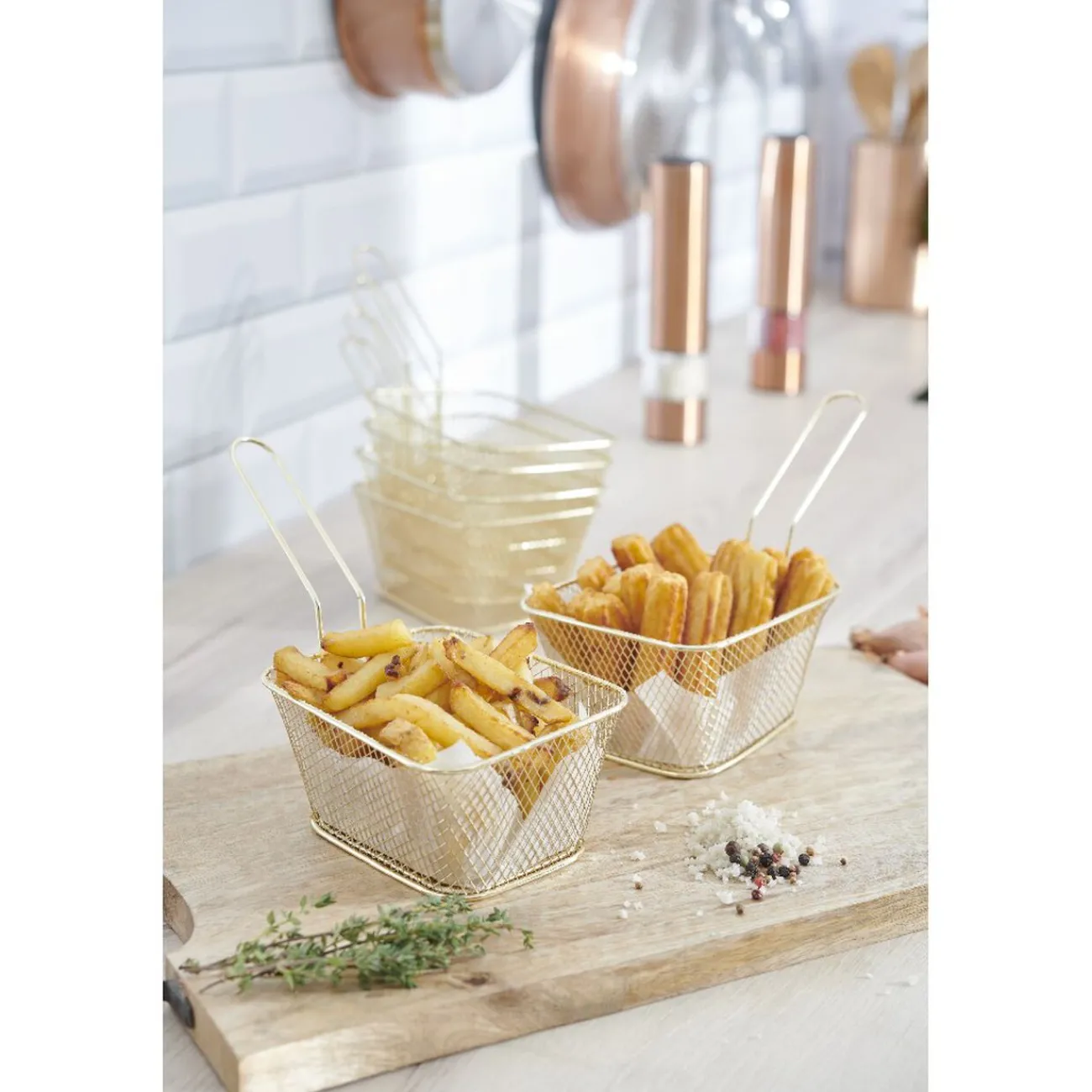 Panier de présentation en métal doré ou argenté, idéal pour servir des frites avec originalité et style.