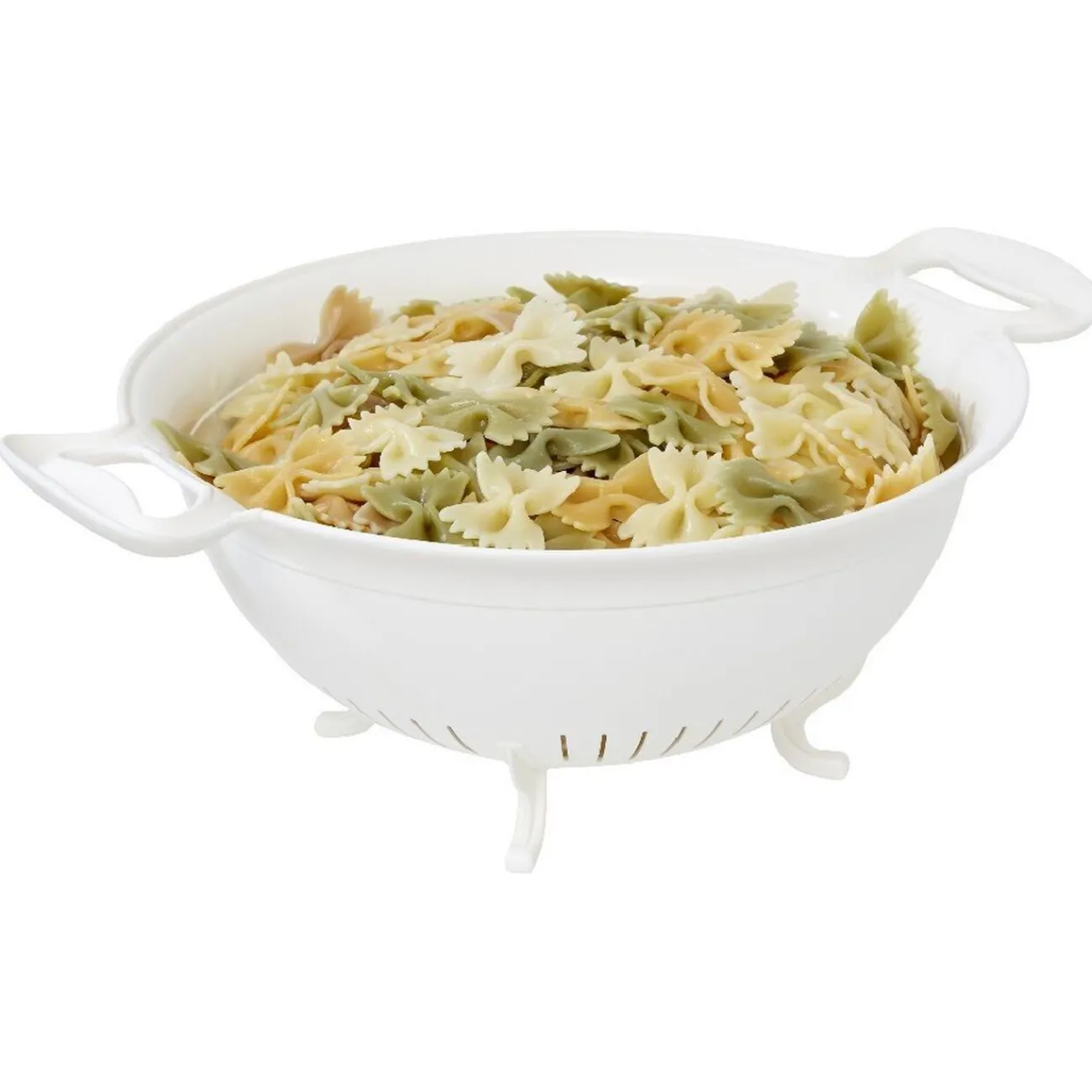 Lot de deux passoires blanches dont une avec manche et un bol uni blanc.