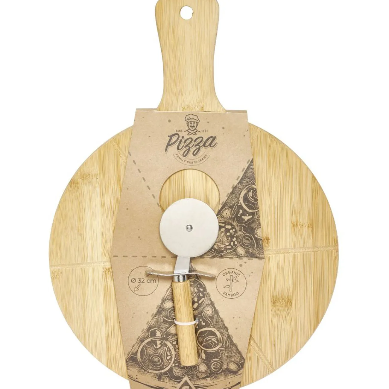 Planche à pizza ronde en bambou avec sa roulette à découper assortie.