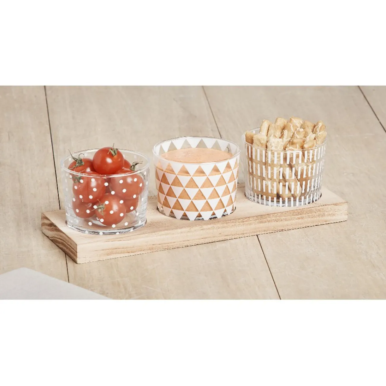Épatez vos invités avec un service inédit grâce à cette planche en bois et ses 3 coupelles en verre. 3 motifs différents pour encore plus d’originalité. Encastrables dans le support en bois, ces coupelles à pois, à traits et à triangles pourront proposer des gressins, des concombres et une sauce crémeuse au paprika.