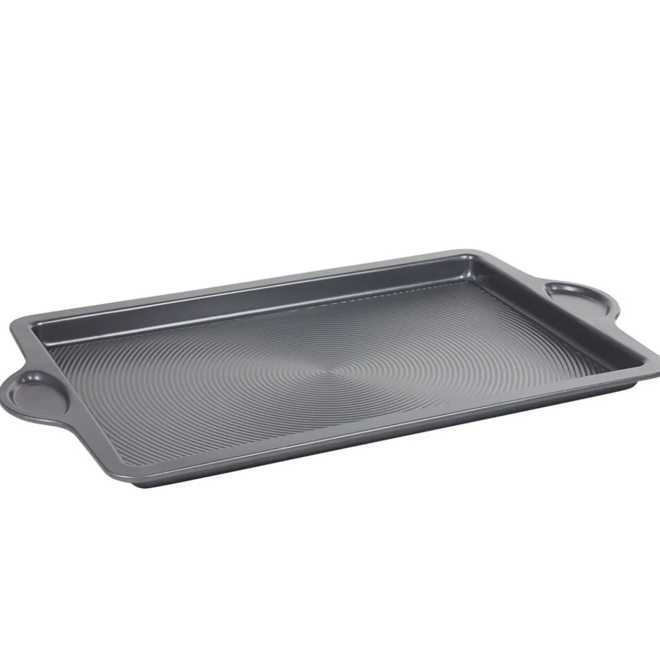 Pratique, cette plaque de cuisson en métal gris comprend un revêtement à fond texturé pour un démoulage facile de vos pâtisseries