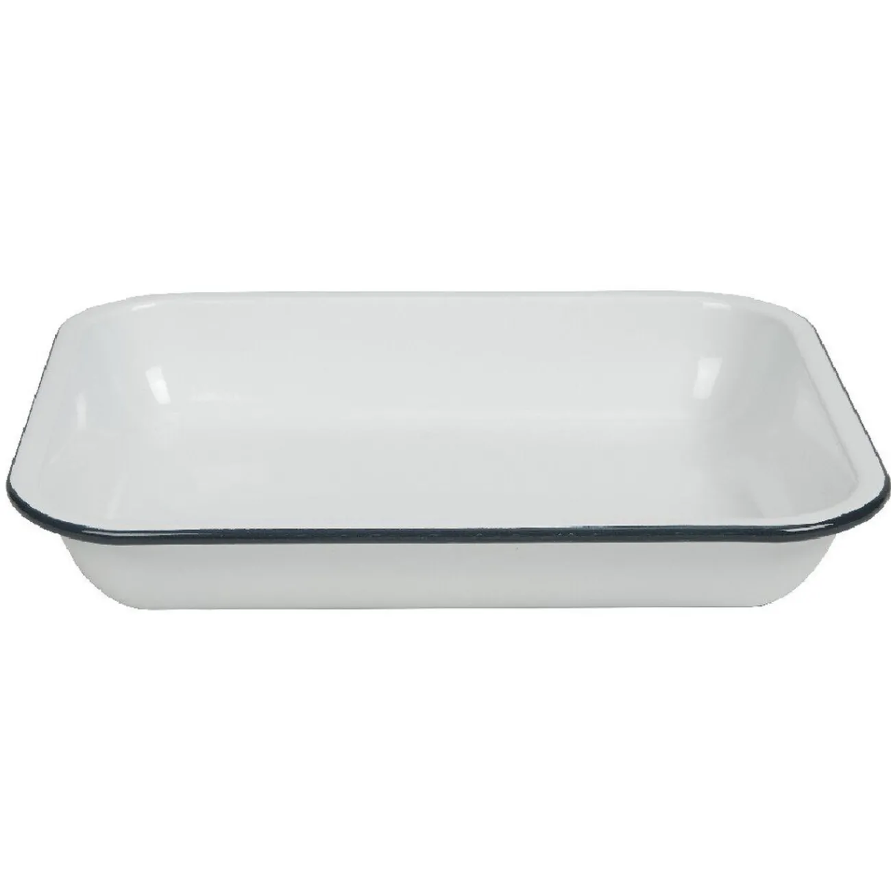 Plat à four en acier émaillé blanc à l’intérieur et bleu sur le contour.